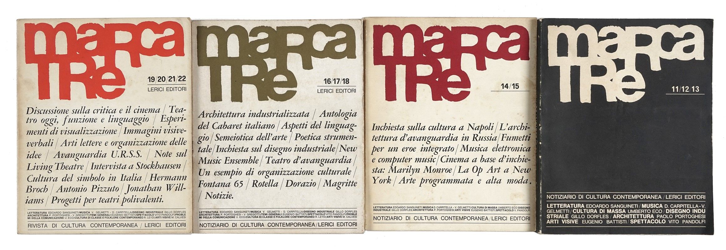14 volumi in-8° (mm 250x200 ca.). Dal n. 1 del novembre 1963 al n. quadrulo 19-22 dell'aprile 1966 (mancante il n. 2), dal n. quadrulo 26-29 del dicembre 1966 al n. 41-42 del maggio-giugno 1968 (mancante il n. 30-33) e il n. 52/2 dell'agosto 1970. Esemplare profusamente illustrato, con gli interventi di Lamberto Pignotti, Eugenio Miccini, Gillo Dorfles, Adriano Spatola, Antonio Bueno, Giuseppe Chiari e moltissimi altri. Ciascun volume si presenta in brossura editoriale, con tracce d'uso, ma complessivamente ben conservata.
