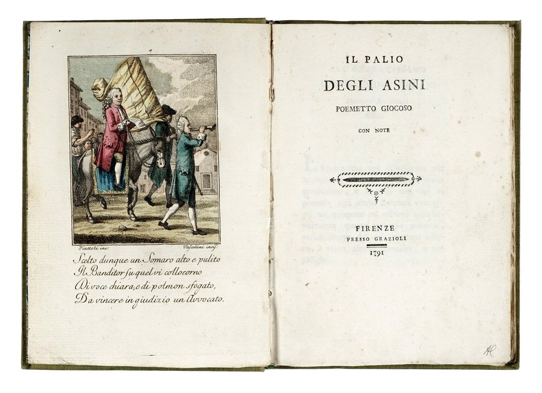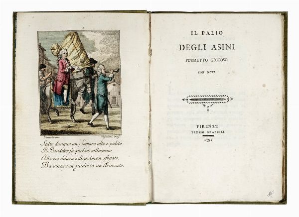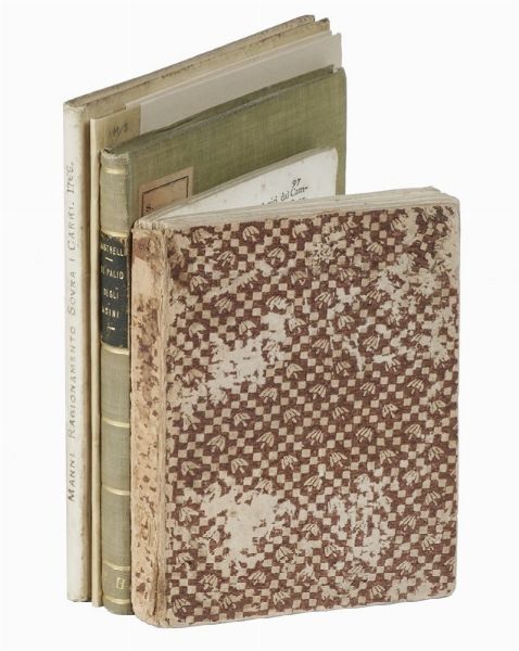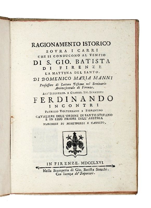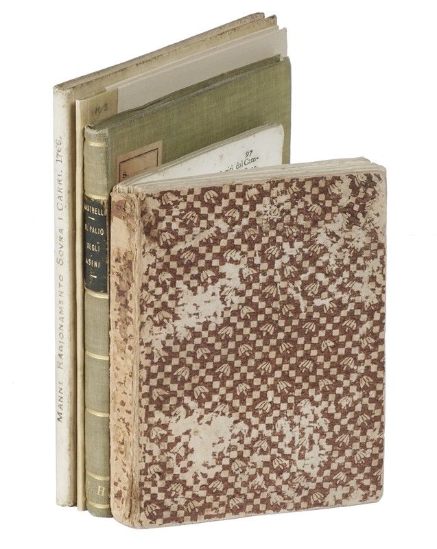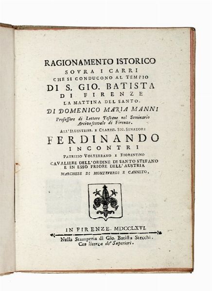 Compongono il lotto: 1) Rastrelli Modesto, Il palio degli asini. Poemetto giocoso con note. Firenze: Grazioli, 1791; 2) Cambiagi Gaetano, Memorie istoriche riguardanti le feste solite farsi in Firenze per la natività di San Gio. Batista protettore della città e dominio fiorentino... In Firenze: nella stamperia Granducale, 1766; 3) Manni Domenico Maria, Ragionamento istorico sovra i carri che si conducono al tempio di S. Gio. Batista di Firenze la mattina del santo... In Firenze: nella stamperia di Gio. Batista Stecchi, 1766. In-4° (mm 205x150). Pagine 7, [1], XXXXVI. Testatine e capilettera in legno. Buona copia. Legatura in piena pergamena con titoli manoscritti al dorso; sguardie rinnovate; 4) Ballo delle zingare rappresentato in Firenze nel Teatro dell'Altezza Serenissima di Toscana nel Carnovale dell'anno 1614. In Firenze: Zanobi Pignoni, 1614.