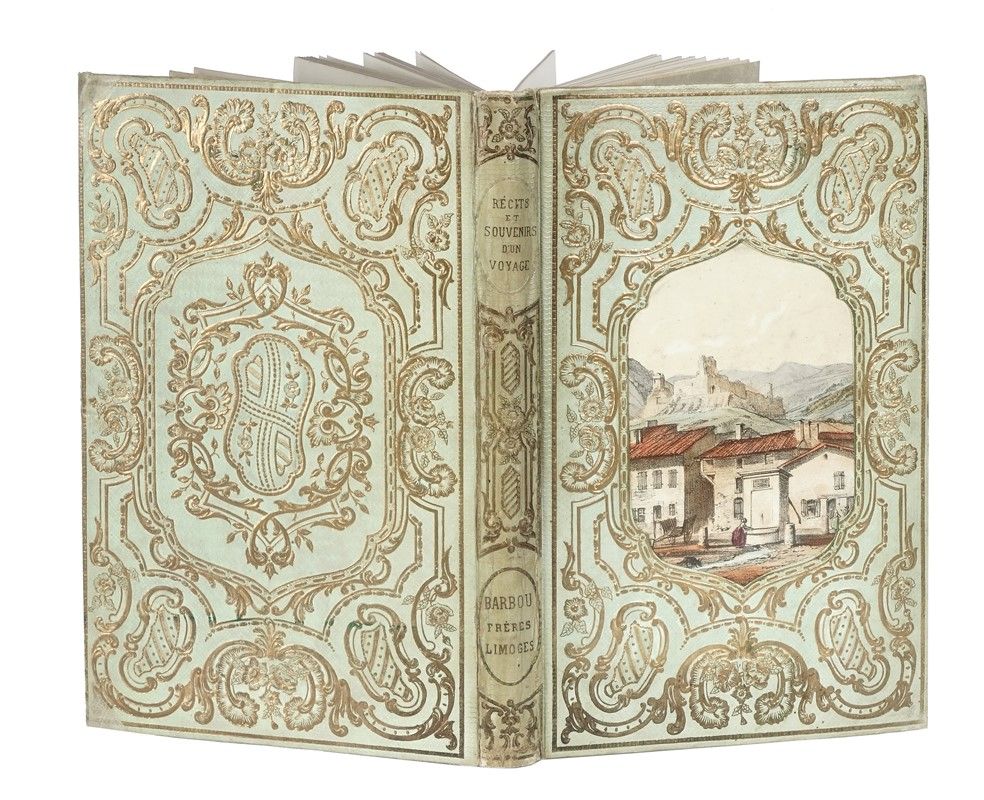 In-4° (mm 241x150). Non collazionato ma presumibilmente completo in bellissima legatura coeva in percallina color salvia chiaro, riccamente decorata da motivi floreali in rilievo, litografia a colori con veduta applicata al centro del piatto anteriore. Ex libris e timbro di Giannalisa Feltrinelli.