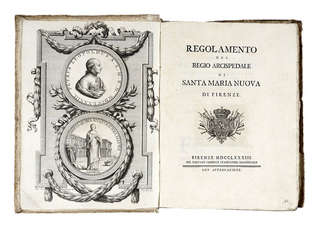 In-4° (mm 288x215). Pagine XIV, 313, 3 bianche, [12], con 1 ritratto di Pietro Leopoldo e una veduta dell'ospedale in ovale incisi in rame in antiporta da Giovan Battista Cecchi, 22 tabelle fuori testo anche a doppia pagina o ripiegate in fine, 1 Pianta del Regio Arcispedale incisa in rame e più volte ripiegata e 4 tavole calcografiche più volte ripiegate incise da Cecchi. Esemplare parzialmente intonso, ad ampi margini e con le tavole in fresca e nitida tiratura. Qualche strappetto marginale e lievi fioriture sparse. Legatura in cartonato, con titoli manoscritti al dorso, parzialmente sbiaditi; macchie ai piatti e dorso rinforzato. Ex-libris al contropiatto anteriore.SI AGGIUNGE: Lumachi Antonio, Memorie storiche dell'antichissima basilica di S. Gio. Battista di Firenze... In Firenze: Lorenzo Vanni, s.d. [i.e. 1782]. SI AGGIUNGE: Fineschi Vincenzio, Il forestiero istruito in S. Maria Novella di Firenze... In Firenze: Nella stamp. già Albizziniana, 1790. SI AGGIUNGE: Id., Memorie sopra il cimitero antico della chiesa di S. Maria Novella di Firenze. Firenze, Francesco Moucke, 1787.