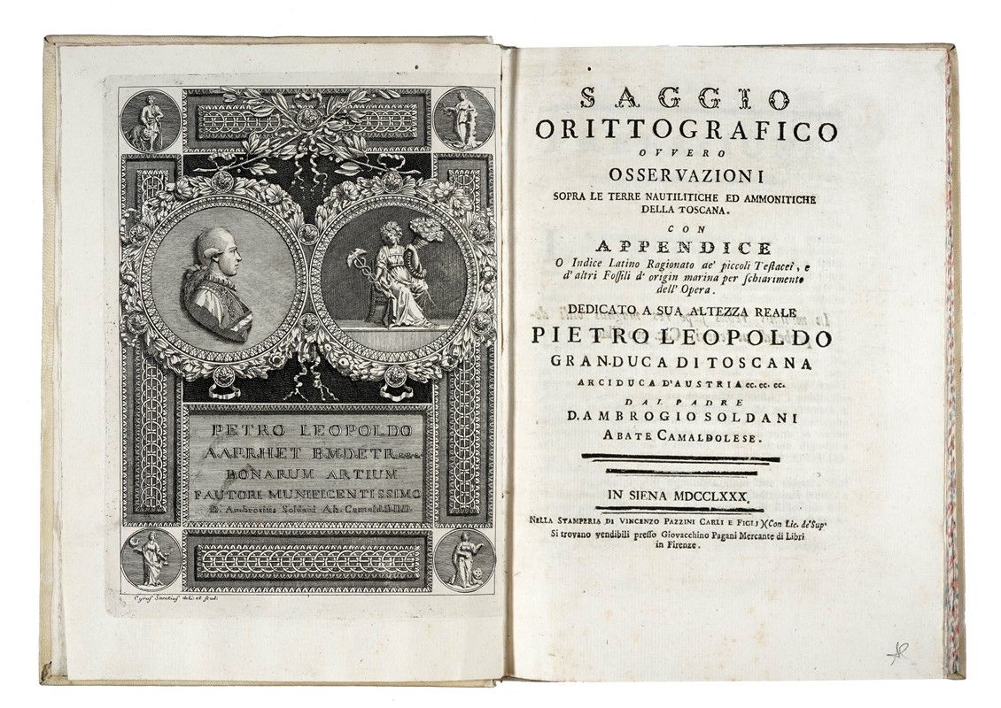 In-4° (mm 260x185). Pagine VII, [1], 146, 2 bianche con 1 antiporta calcografica e 25 tavole fuori testo numerate I-XXV legate in fine di volume, tutte in calcografia. Un forellino di tarlo marginale a tutto il volume, che non coinvolge l'inciso, due, più grandi, maldestramente restaurati alle tavole XXIII-XXV, altrimenti buona copia in barbe. Legatura coeva in piena pergamena con titoli in oro al dorso a 5 nervetti. Lievi mancanze a 2 comparti del dorso, ma nel complesso ottima conservazione. SI AGGIUNGE: Giuli Giuseppe, Saggio statistico di mineralogia utile della Toscana per servire agli ingegneri, ai possidenti... Bologna: s.e., 1843.