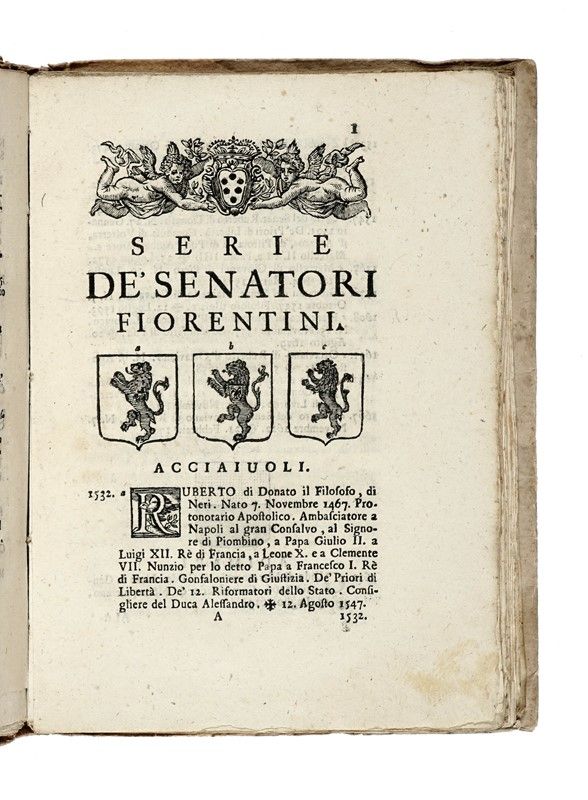 In-4° (mm 220x160). Pagine XXII, 28, 118. Bella antiporta allegorica incisa in rame fuori testo e numerosi stemmi genealogici nel testo. Bell'esemplare con barbe nonostante alcune lievi fioriture. Legatura in cartonato, con titoli manoscritti al dorso. Mancanza ricostruita al foglio di guardia posteriore e piatto gorato. SI AGGIUNGE: Il governo della Toscana sotto il regno del Granduca Pietro Leopoldo… Cremona: Per Lorenzo Manini, 1787. SI AGGIUNGE: Passerini Luigi, Le armi dei municipi toscani... Firenze: s.e., 1864.