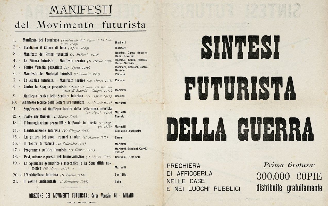 In-4° (mm 290x230). Carte [2] stampate recto/verso. Segno centrale di precedente piegatura, qualche forellino di tarlo che coinvolge l'inciso, rari strappetti e lievi fioriture marginali. Manifesto interventista sottoscritto Dal Cellulare di Milano, Marinetti, Boccioni, Luigi Russolo Ugo Piatti e Carlo Carrà, che ha realizzato la composizione grafica del cuneo futurista contro il passatismo.