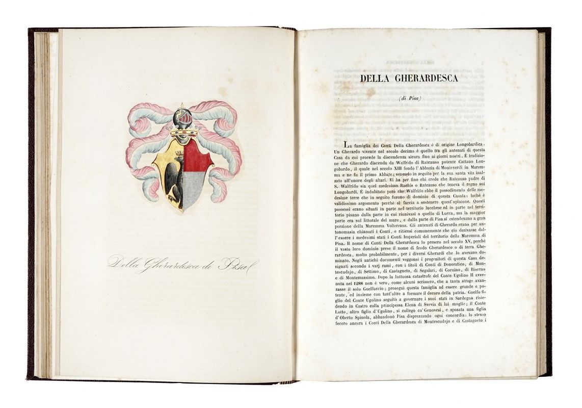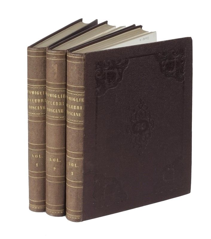 3 volumi in-8° grande (mm 258x180). Con moltissime tavole litografiche fuori testo in coloritura coeva. Un'ampia gora nella parte iniziale del primo volume e fioriture diffuse, ma nel complesso buona copia. Legatura coeva in piena pelle, con fregi fitomorfi a secco ai piatti e titoli in oro al dorso. Tracce di bruniture di esposizione al dorso. Collazione disponibile su richiesta.