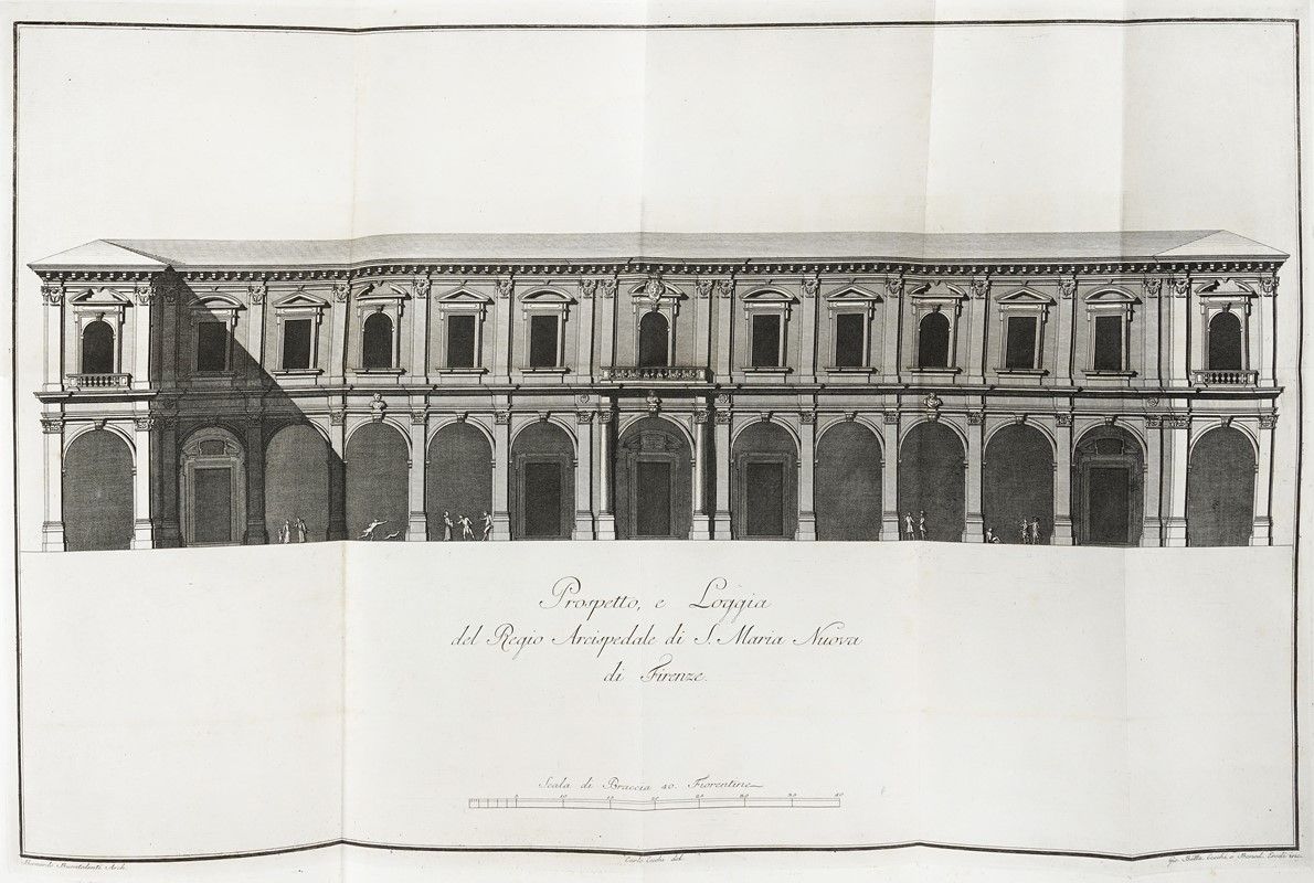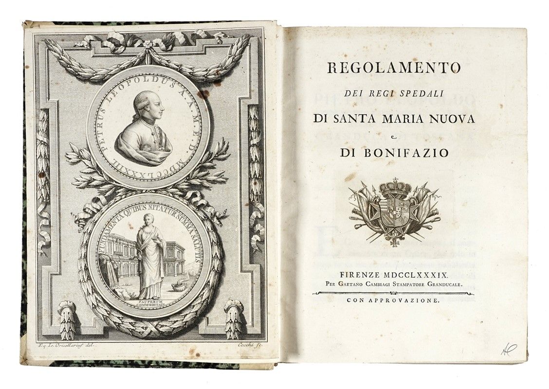 2 parti in 1 volume in-4° (mm 245x185). Pagine [8], 36, 132, CXXXII, [2]; [4], 350, [2] con 18 tavole incise in rame fuori testo e ripiegate con vedute e tabelle. Esemplare con bruniture diffuse e ampie fioriture, soprattutto alle tavole. Legatura in mezza pergamena con piatti marmorizzati e titoli impressi in oro su tassello al dorso. SI AGGIUNGE: Covoni Girolami Marco, Regolamento dei Regi Spedali di Santa Maria Nuova e di Bonifazio. Firenze: per Gaetano Cambiagi Stampatore Granducale, 1789.