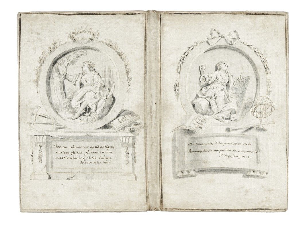 In-8° (mm 217x140 mm.). Pagine: 50, [2, bianche]. Piccolo fregio xilografico al frontespizio, stampato su carta forte. Frontespizio con piccola porzione di margine inferiore asportata, taglio alla carta successiva, per il resto copia bellissima in una legatura coeva in seta avorio dipinta a mano ai piatti con due figure allegoriche femminili, e con citazioni da Virgilio in calce (minime tracce d'uso). Sguardie marmorizzate, tagli spruzzati di rosso, custodia cartonata marmorizzata coeva.
