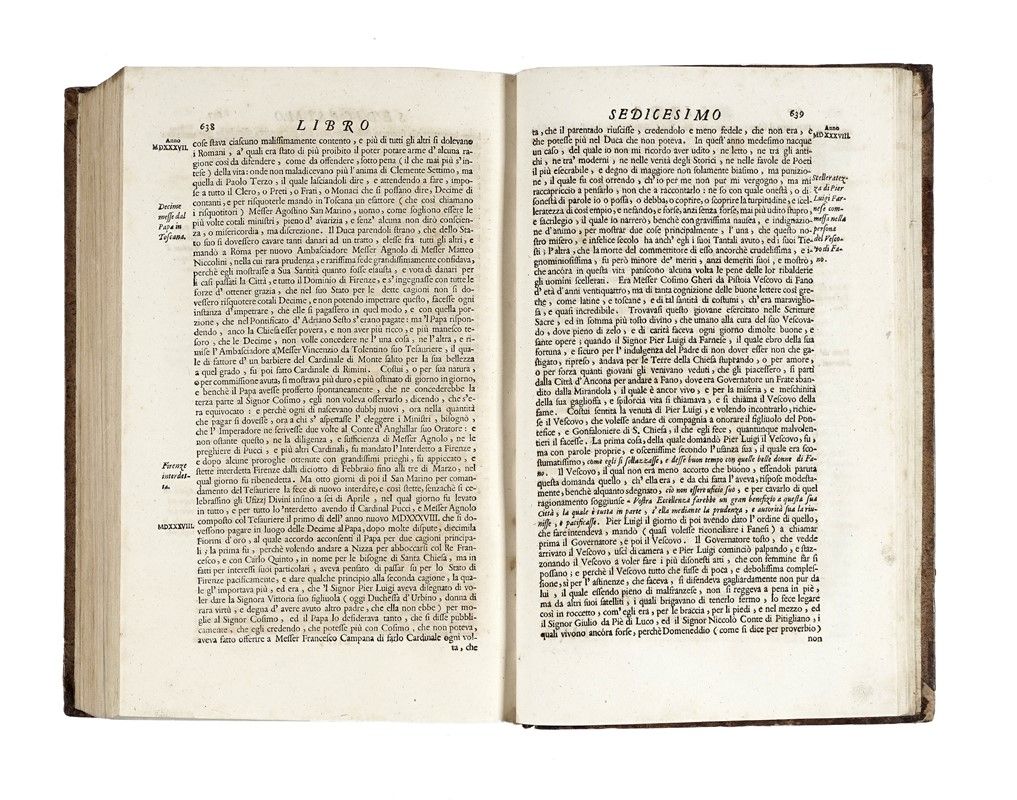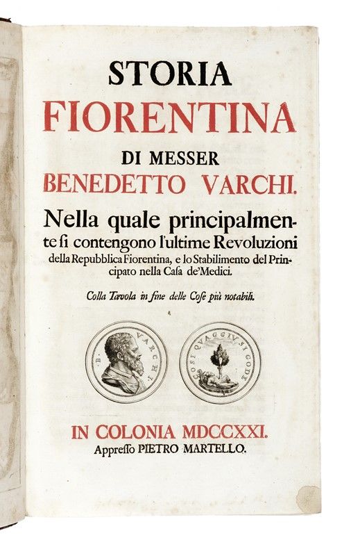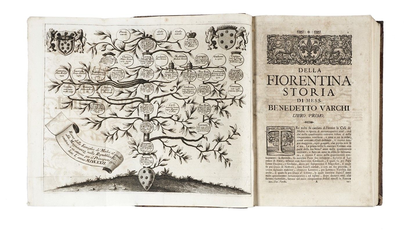 In-folio (mm 320x200). Con 1 antiporta incisa, 1 ritratto dell'Autore e 1 albero genealogico dei Medici inciso a doppia pagina. Buona copia, con arrossature sparse, fioriture e gore diffuse. Altri difetti da controllare. Legatura in mezza pelle, con fregi e titoli in oro su tassello al dorso; sguardie rinnovate. Tracce d'uso. Ex-libris al contropiatto anteriore e annotazione manoscritta all'antiporta. SI AGGIUNGE: Id., L'Ercolano. Dialogo nel quale si ragiona delle lingue. Ed in particolare della toscana e della fiorentina. In Firenze: nella stamperia di S.A.R. per gli Tartini, e Franchi, 1730.