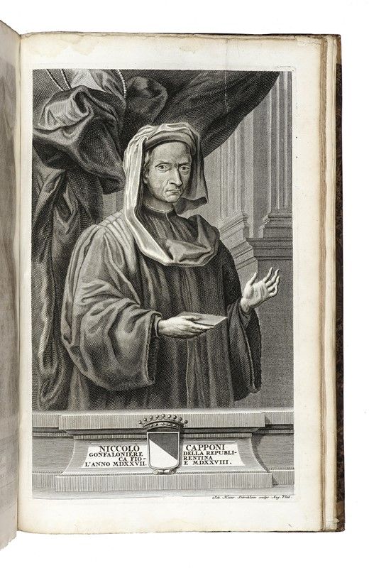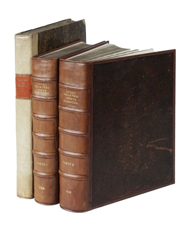 2 parti in 1 volume in-folio (mm 380x235). Pagine [12], 384, [46]; [2], 42, [4] con 2 ritratti incisi in rame fuori testo. Frontespizio in inchiostro rosso e nero, testatine, capilettera e finalini xilografici. Lieve brunitura delle carte in corrispondenza dello specchio di stampa e alcune pagine marginalmente gorate ma buona copia, completa e in barbe. Legatura coeva in mezza pergamena, con punte e piatti marmorizzati, con titoli in oro su tassello al dorso. Annotazioni parzialmente cancellate al contropiatto ed ex-libris rimosso. SI AGGIUNGE: Spannagel Gottfried Philipp (von), Notizia della vera libertà fiorentina considerata ne' suoi giusti limiti, per l'ordine de' secoli... Parte I (-III). [Milano]: s.e., 1724. 3 parti in 2 volumi in-folio (mm 320x210).