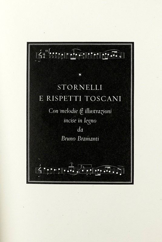 In-8° (mm 265x180). Dodici canzoni popolari raccolte ed illustrate con 38 xilografie di Bruno Bramanti. Ottima copia in barbe, parzialmente intonsa. Legatura in cartonato editoriale, con titoli su tassello al piatto anteriore e al dorso, protetta da velina. entro astuccio. Tiratura in 150 esemplari numerati. Astuccio originale coordinato, con difetti ai tagli.