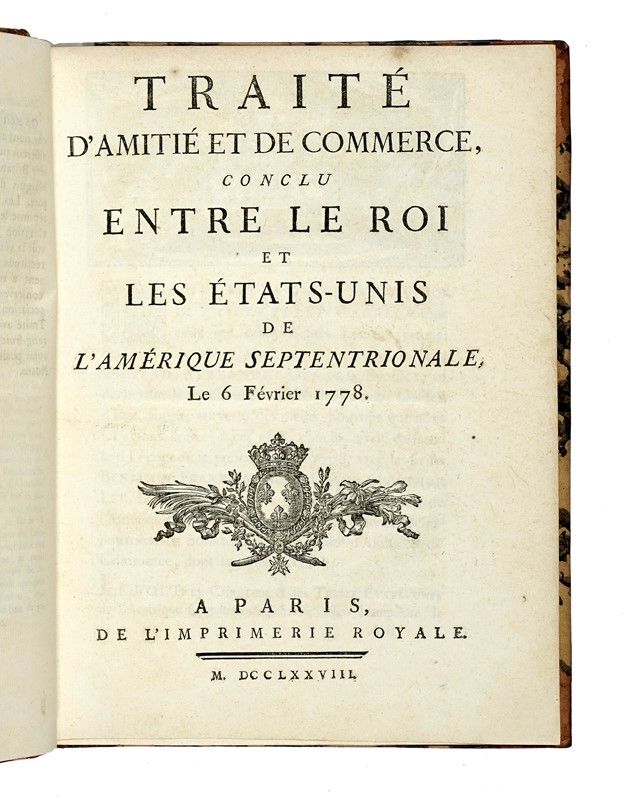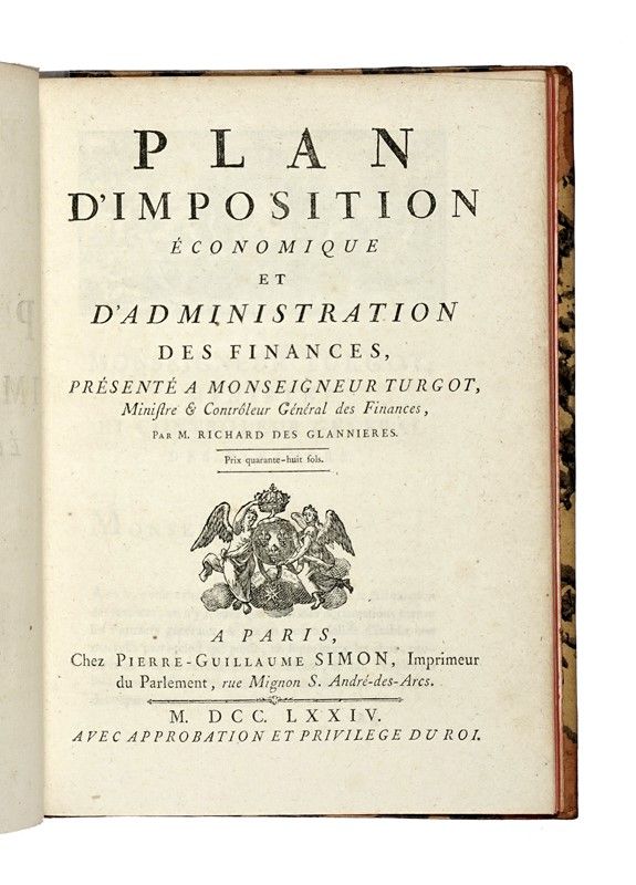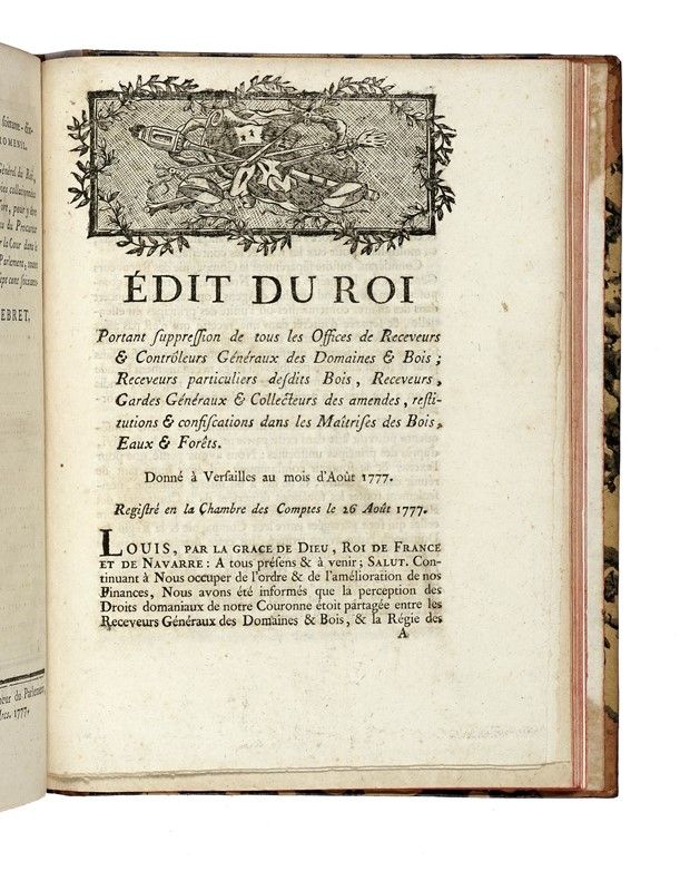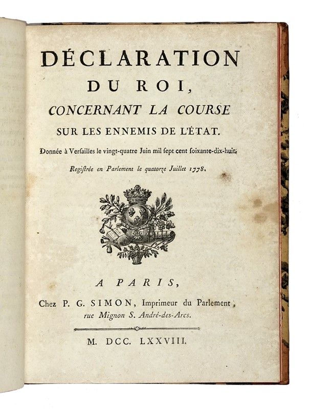 In-4° (mm 244x186). Pagine: 23, [1]. Stemma reale al frontespizio, testatina, iniziale e finalino xilografici. Un fascicolo pallidamente arrossato. [RILEGATO CON:] Exposé des motifs de la conduite de Sa Majesté Très-Chrétienne, relativement à l'Angleterre... (A Madrit [sic]: 1779). 46, [2] pp.; Déclaration du Roi, concernant la course sur les ennemis de l'État... Paris: P. G. Simon, 1778. 15, [1] pp.; Ordonnance du Roi, concernant les prises faites par les Vaisseaux, Frégates & autres Bâtimens de Sa Majesté... Paris: Imprimerie Royale, 1778. 15, [1] pp; Des Glannieres Richard, Plan d'imposition économique et d'administration des finances, présenté a monsieur Turgot... Paris, P. G. Simon, 1772. 35. [3] pp. Con 3 tabelle ripiegate. E con altri 11 bandi stampati tra il 1774 e il 1777 relativi al commercio di granaglie e farine, alla creazione di grandi strade, al permesso di far circolare liberamente il vino nel reame e di venderlo ovunque, alla creazione di una commissione per migliorare gli ospedali, ecc. Qualche fascicolo occasionalmente arrossato, qualche fioritura, editto sui vini pallidamente brunito, con un piccolo restauro al margine inferiore (senza perdite) e con i margini inferiore tagliati male (senza perdite), alcuni editti leggermente più piccoli di altri, ma tutti collazionati completi. Elenco su richiesta. Elegante legatura coeva in mezzo vitellino marezzato, dorso a nervi con tassello in marocchino rosso con su scritto "misel-lanea" e con fregi dorati, piatti rivestiti in carta marmorizzata, tagli rossi (minime abrasioni).