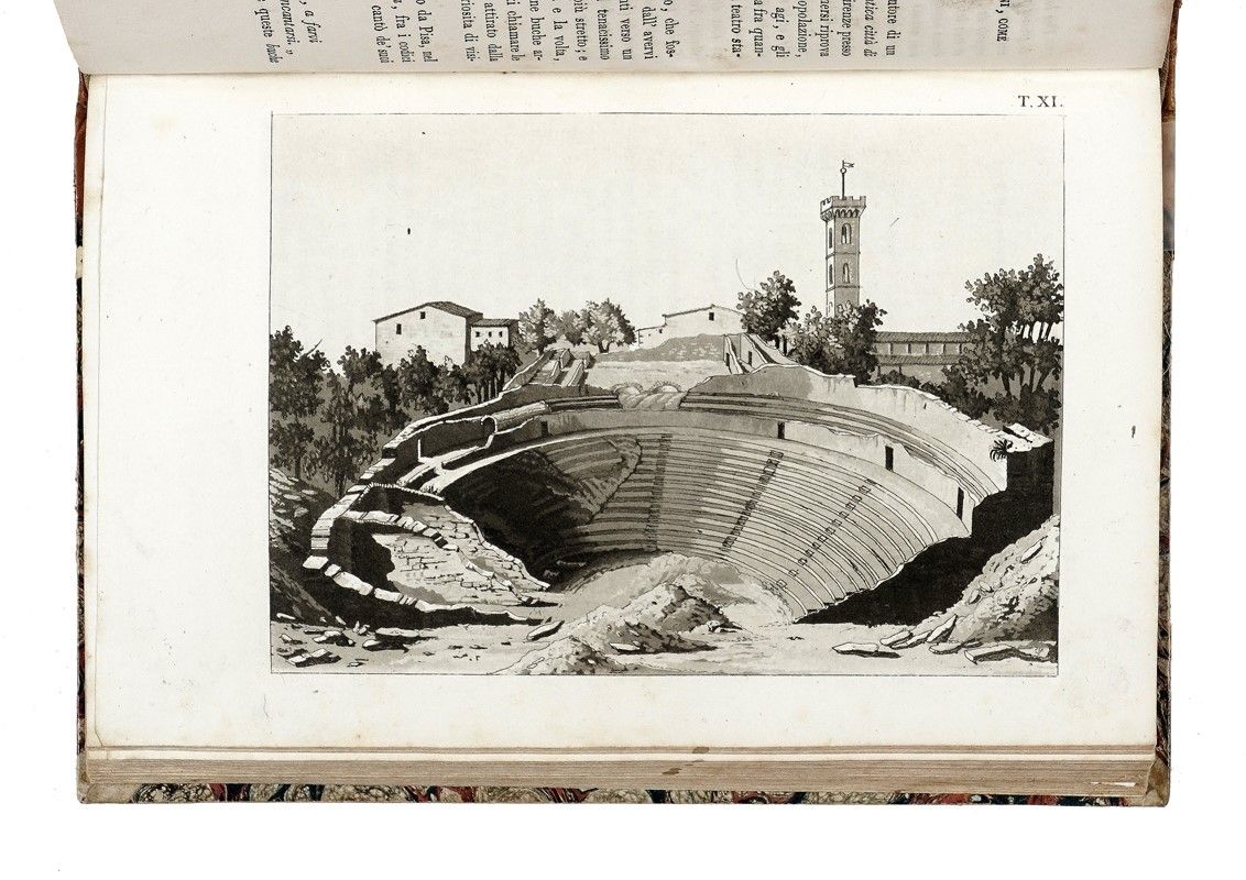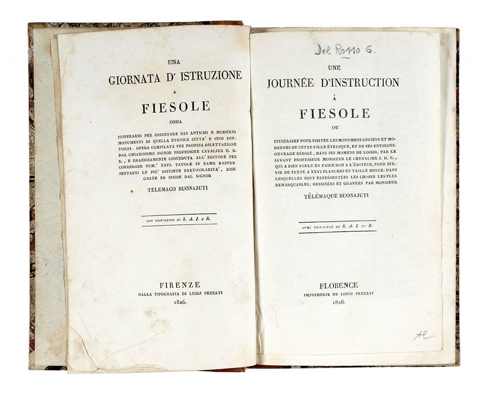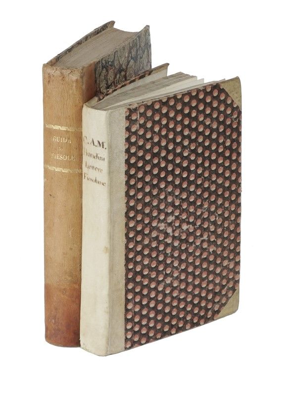 In-8° (mm 220x135). Pagine XLV, [3] bianche, 297, [1] con, complessivamente, 26 tavole fuori testo, di cui 20 belle vedute all'acquatinta e 6 tavole calcografiche ripiegate. Rilegato l'avviso Pei Signori associati... col testo in italiano e in francese. Uno strappetto restaurato con nastro adesivo alla carta XIX-XXX e fioriture diffuse. Legatura in mezza pelle, con piatti marmorizzati e titoli in oro al dorso; sguardie rinnovate. Ex-libris al contropiatto anteriore. SI AGGIUNGE: Bandini Angelo Maria, Lettere XII nelle quali si ricerca, e s'illustra l'antica e moderna situazione della città di Fiesole e suoi contorni... In Siena: dai torchi di Luigi e Benedetto Bindi, 1800.