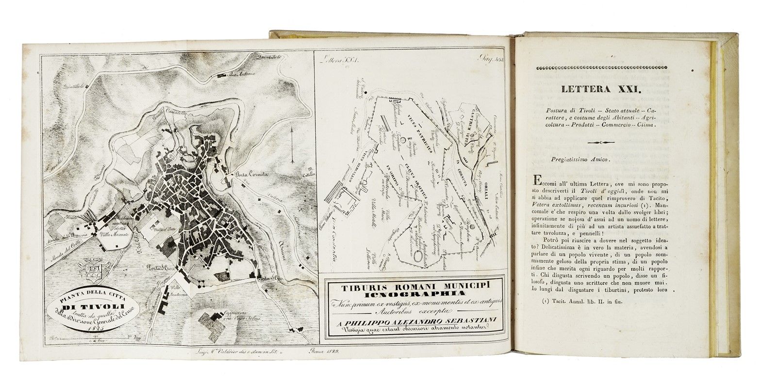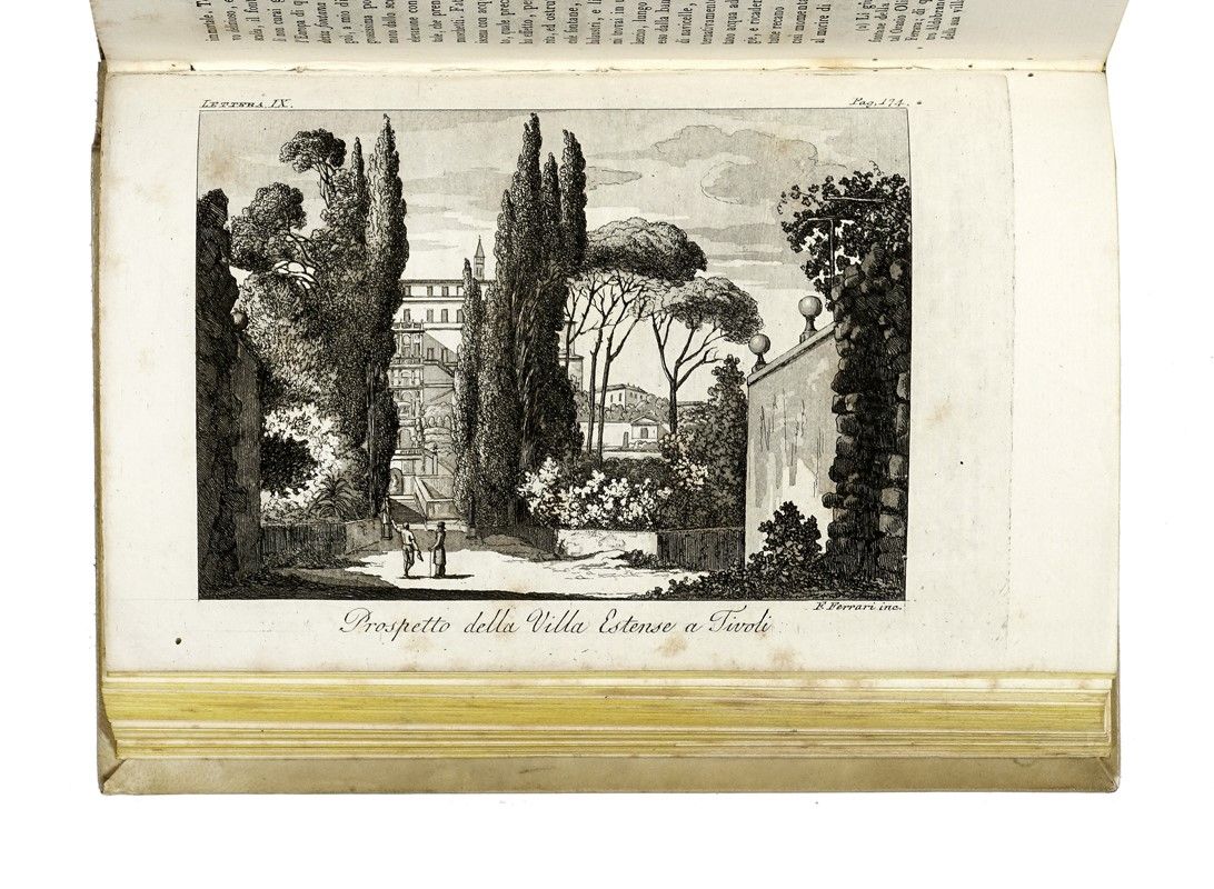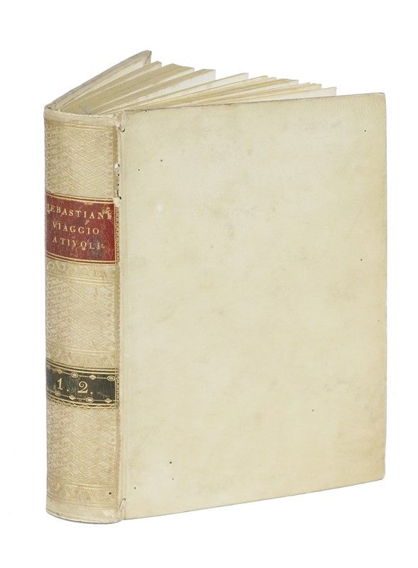 In-4° (mm 218x134) in 2 parti. Testo non collazionato, 23 tavole calcografiche (alcune ripiegate). Sottile galleria di tarlo al frontespizio e alle carte successive, e poi anche al margine interno (senza perdite), fioriture occasionali. Elegante legatura coeva in piena pergamena rigida, dorso riccamente decorato in oro con doppio tassello, tagli gialli.