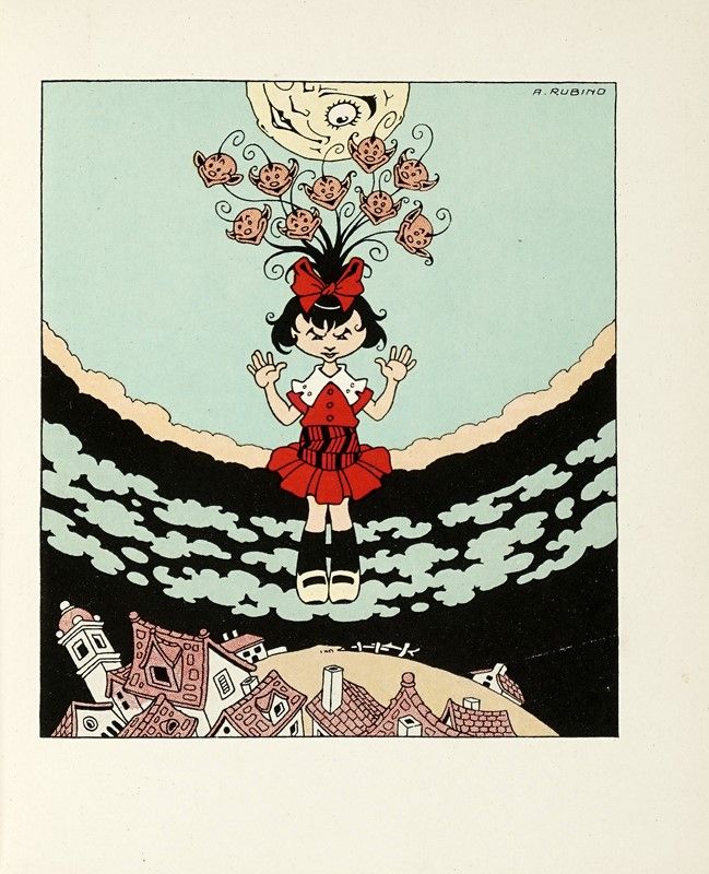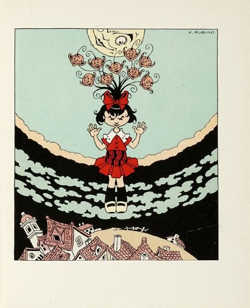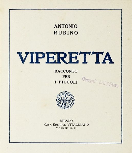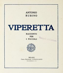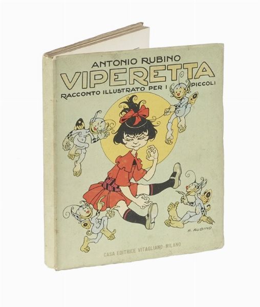 In-8° (mm 245x197). Pagine 163, [1], con 8 tavole a colori fuori testo di Antonio Rubino. Frontespizio in nero e blu entro cornice tipografica, numerose illustrazioni a piena pagina nel testo. Esemplare ben conservato, con lievi e diffuse fioriture. Brossura editoriale a colori con titoli e illustrazione di Rubino al piatto anteriore e sguardie decorate, lievemente lisa alle cuffie e lungo le cerniere e con tracce di polvere ai piatti. Omaggio dell'editore stampigliato al frontespizio.