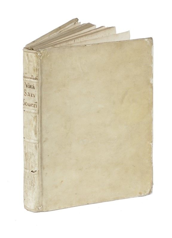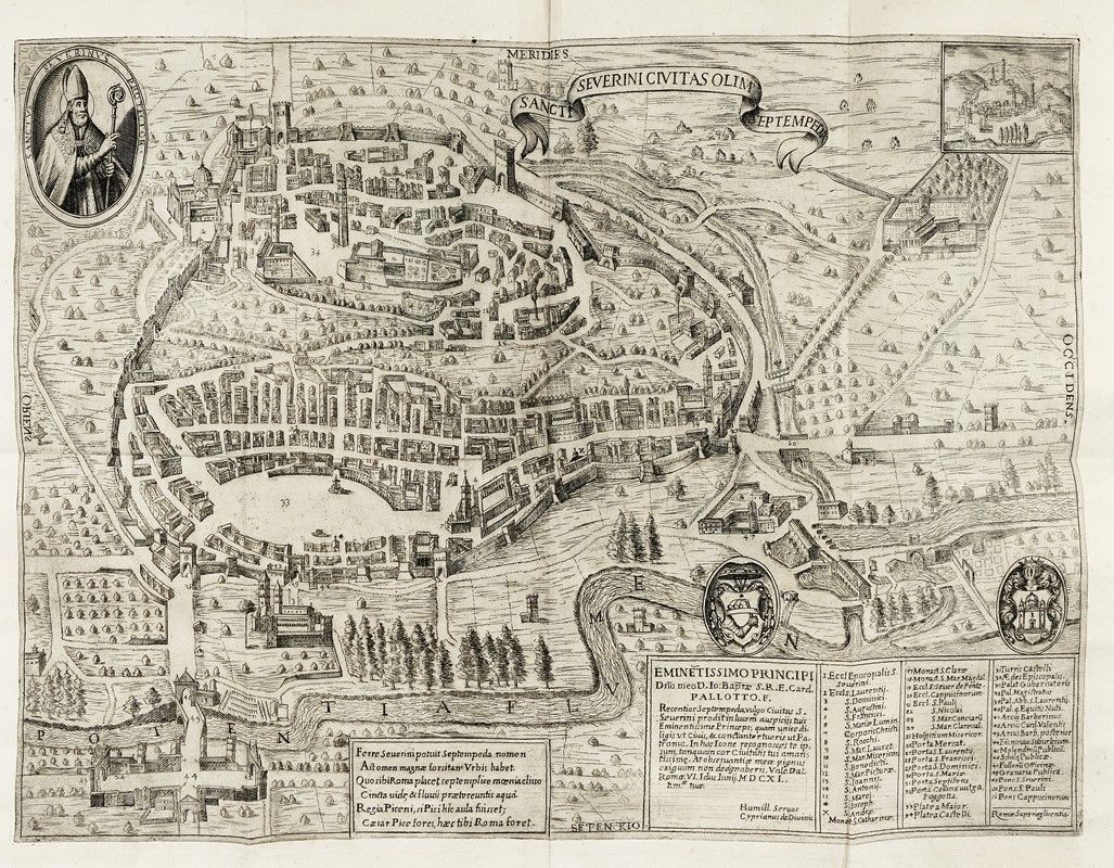 In 4° (mm 213x152). Pagine [8], 255, [8]. Frontespizio e 4 incisioni su rame a piena pagina, grande tavola calcografica con veduta aerea di San Severino Marche più volte ripiegata in fine. Pergamena semi-flessibile coeva con il titolo anticamente manoscritto al dorso. Rilegato tra le pp. 208-[209] un bifolio extra, pallide bruniture/fioriture occasionali e altre trascurabili tracce del tempo. Nel complesso buona copia genuina con la pianta di San Severino su carta forte e in freschissima impressione.