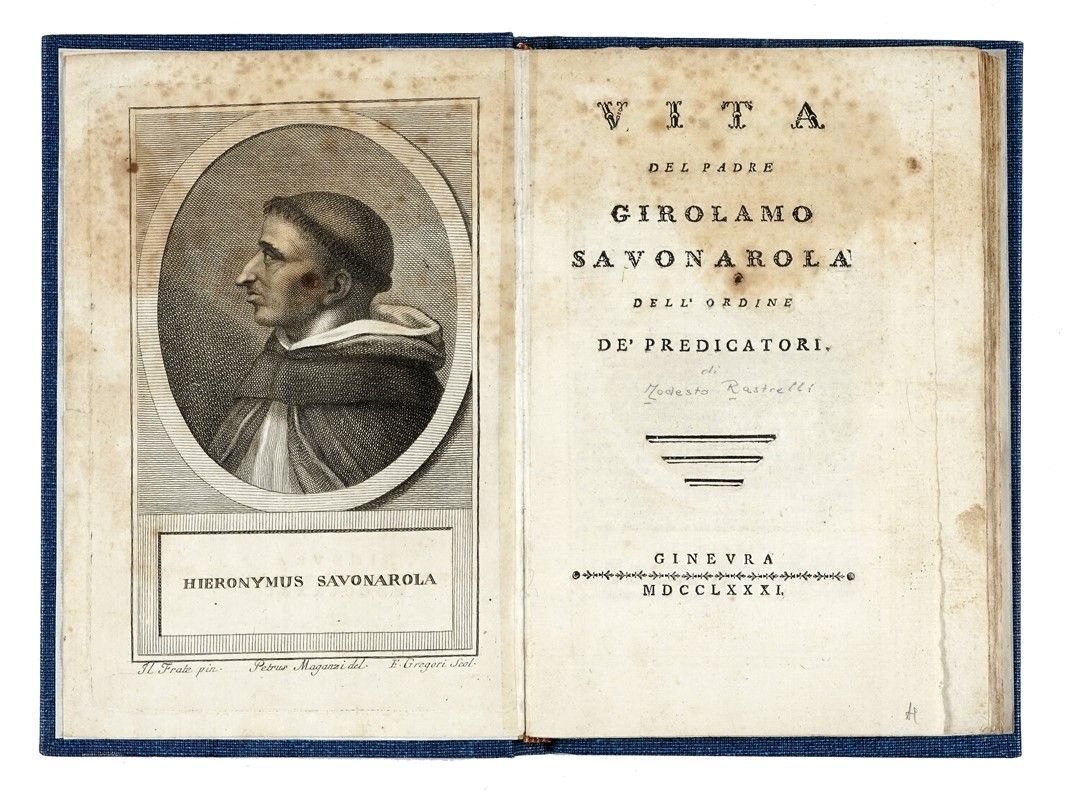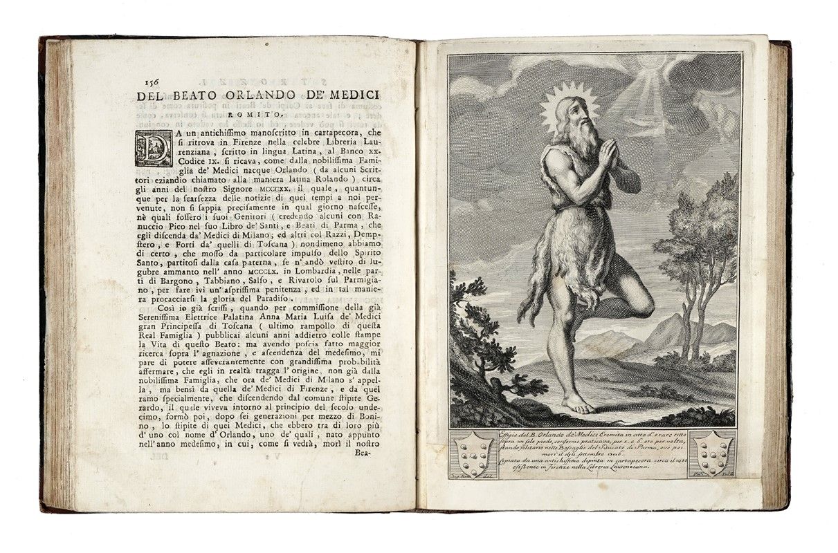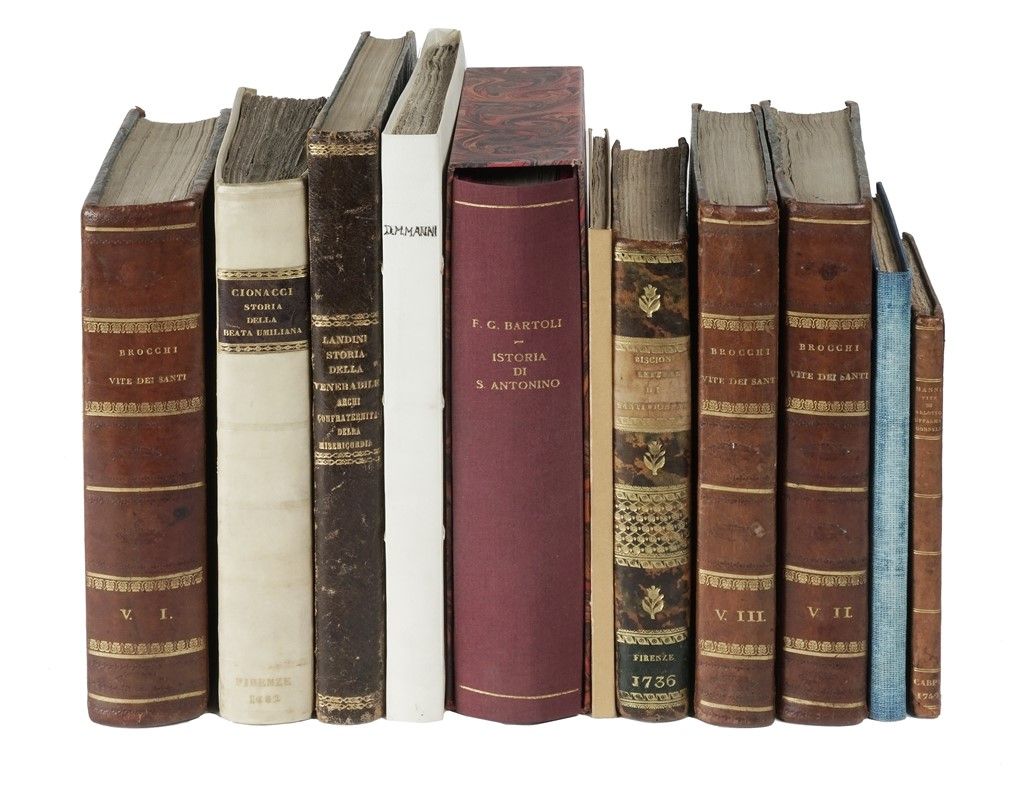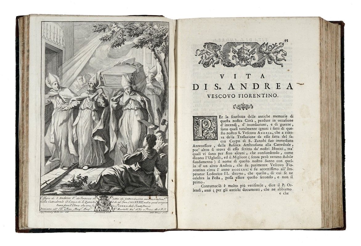 In-4° (mm 250x180). Con 20 tavole calcografiche a piena pagina fuori testo. Frontespizio impresso in rosso e nero con stemma in rame del Cardinal Corsini. Testatine, capilettera e fregi in legno nel testo. Legatura in mezza pelle con punte e piatti marmorizzati, titoli in oro al dorso. Esemplare con difetti da controllare. SI AGGIUNGE: Vite de' santi e beati fiorentini [...]. Aggiuntavi in fine la vita dell'autore. In Firenze: nella stamperia di Gaetano Albizzini, 1761. SI AGGIUNGE: Id., Vite di santi e beati fiorentini di quei santi e beati che hanno ab immemorabili il pubblico culto alle loro reliquie ed immagini. In Firenze e in Pisa : per Gio. Paolo Giovannelli, 1765. SEGUONO: 4) Manni Domenico Maria, Ragionamenti [...] sulla vita di San Filippo Neri fiorentino... In Firenze: Giuseppe Tofani, 1785; 5) Id., Principi della religione cristiana in Firenze... In Firenze: Pietro Gaetano Viviani, 1764; 6) Rastrelli Modesto, Vita del Padre Gerolamo Savonarola dell'ordine de' predicatori... Ginevra: s.e. 1781; 7) Landini Placido, Storia della Venerabile Arciconfraternita della Misercicordia… Livorno: Zecchini, 1871; 8) Bartoli Guglielmo, Istoria dell'arcivescovo S. Antonino e de' suoi più illustri discepoli coll'apologia di F. Girolamo Savonarola... Firenze: Anton Giuseppe Pagani, 1782. Elenco completo disponibile su richiesta. Lotto non passibile di restituzione.