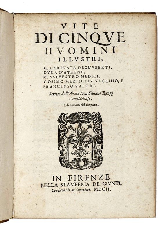 In-4° (mm 210x150). Pagine [12], 198, [6]. Marca tipografica xilografica al frontespizio. Fioriture sparse, bruniture lievi concentrate in alcune pagine. Legatura in piena pergamena, titoli manoscritti al dorso. Ex-libris al contropiatto anteriore. SI AGGIUNGE: Villani Filippo, Le vite d'uomini illustri Fiorentini, scritte da Filippo Villani, Ora per la prima volta [...] colle Annotazioni del Conte Giammaria Mazzuchelli. Venezia: Presso Giambatista Pasquali, 1747. SI AGGIUNGE: Mini Paolo, Discorso della nobiltà di firenze, e de fiorentini... In Firenze: per Domenico Manzani, 1593. SI AGGIUNGE: Manni Domenico Maria, Le veglie piacevoli [...]. Tomo primo (-quarto). In Firenze: Stecchi, 1757-1760.