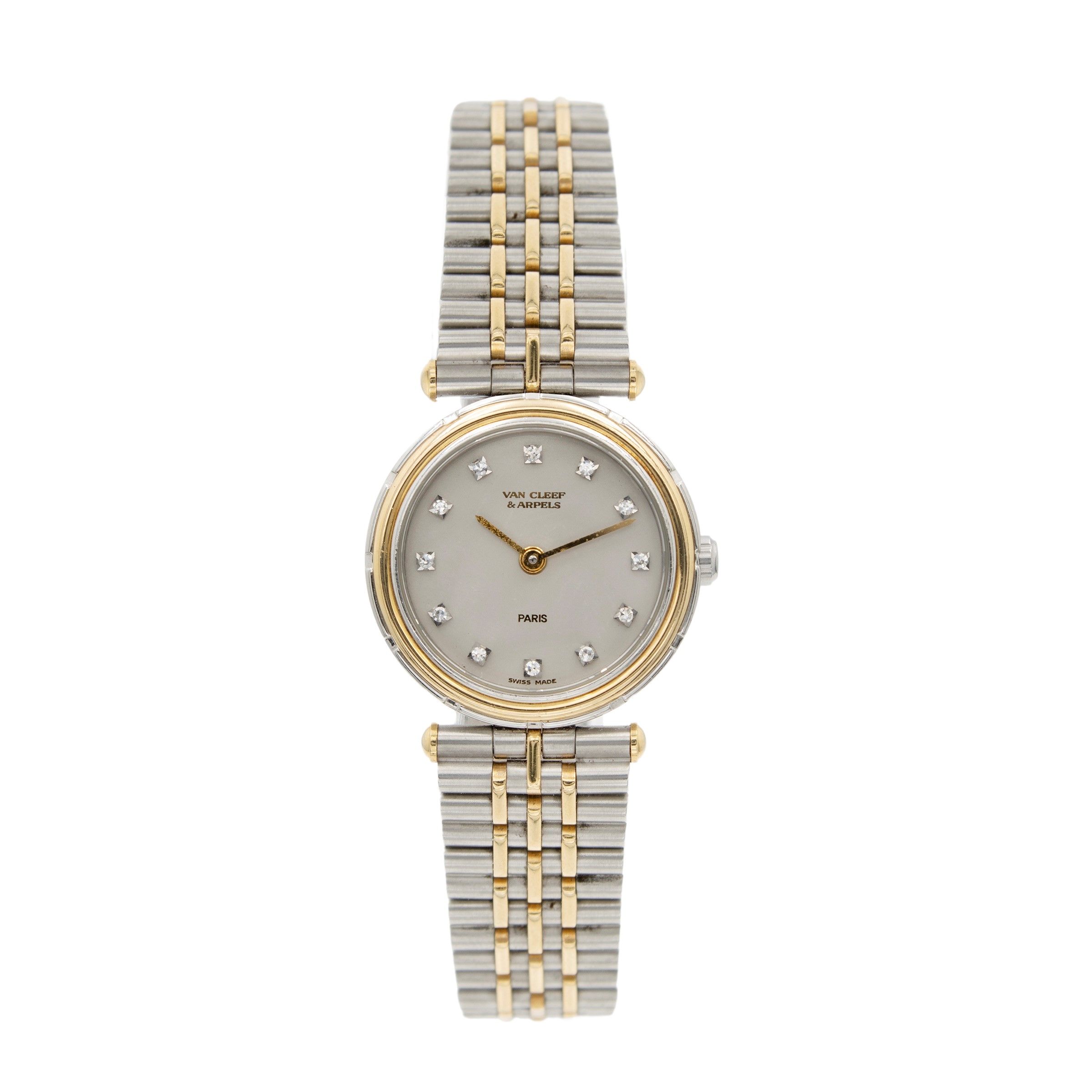 anni 90 circa in oro giallo e acciaio, ref. 466303 - 29488, cassa 29 mm. quadrante grigio, indici con diamanti taglio brillante, vetro zaffiro, movimento al quarzo, bracciale in oro e acciaio con chiusura deployante, completo di scatola e garanzia