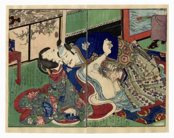 Xilografia a colori (nishiki-e). Formato: chûbon tate-e (mm 174x222 su due fogli). Data: periodo Meiji (anni 1870/1880). SI AGGIUNGE: Toyohara Chikanobu (1838-1912). Uomo con due concubine. Xilografia a colori (nishiki-e). Formato: chûbon tate-e (mm 126x183). Data: periodo Meiji (anni 1870/1880). Bibliografia: Pietro Gobbi, Stefano Liberati, Shunga-e "immagini di primavera", catalogo della mostra, Accademia Nazionale d'Arte Antica e Moderna Onlus Editore, Torino 2016 (riprodotte, pp. 58-59).
