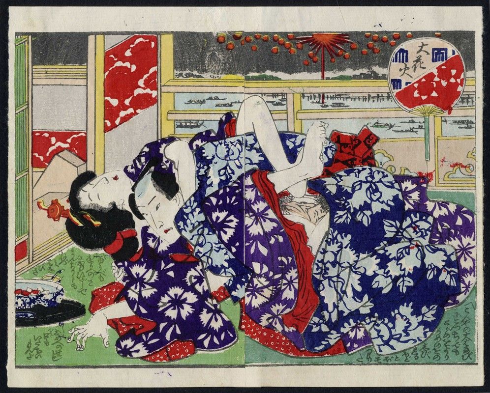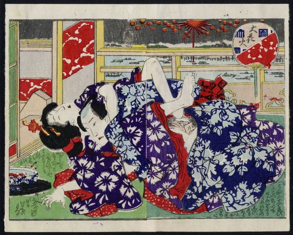 Xilografia a colori (nishiki-e). Formato: chûbon tate-e (mm 153x210 su due fogli). Data: Ansei (decade 1850). Nei cartigli rossi a forma di ventaglio su uno compare la scritta "Uchiku", un rione di Edo visibile nel panorama sullo sfondo lungo il fiume Sumida; nell'altro cartiglio compare la scritta "Ôhanabi", i grandi fuochi d'artificio che si tenevano in estate lungo il fiume Sumida presso il ponte Ryôgoku. Bibliografia: Pietro Gobbi, Stefano Liberati, Shunga-e "immagini di primavera", catalogo della mostra, Accademia Nazionale d'Arte Antica e Moderna Onlus Editore, Torino 2016 (riprodotte, pp. 40-41).