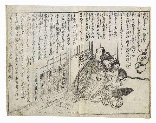 Xilografia in toni di grigio (sumi-e). Formato: chûbon tate-e (mm 135/155x205/212i su due fogli). Data: Tenpô/Kôka (decade 1840). Bibliografia: Pietro Gobbi, Stefano Liberati, Shunga-e "immagini di primavera", catalogo della mostra, Accademia Nazionale d'Arte Antica e Moderna Onlus Editore, Torino 2016 (riprodotte, pp. 32-33).