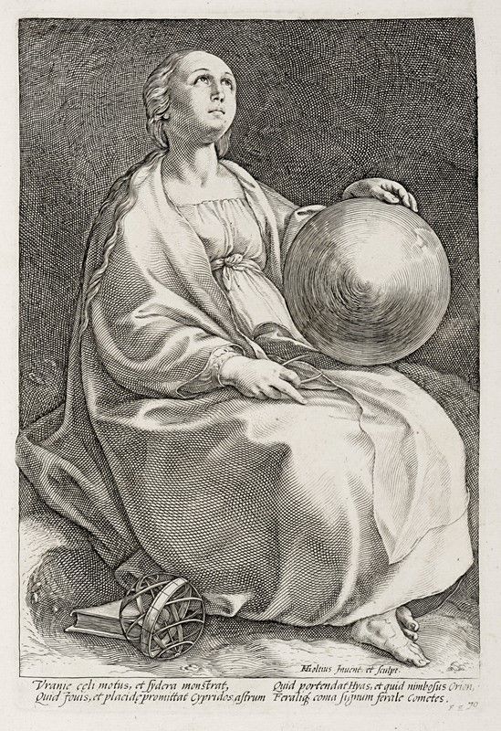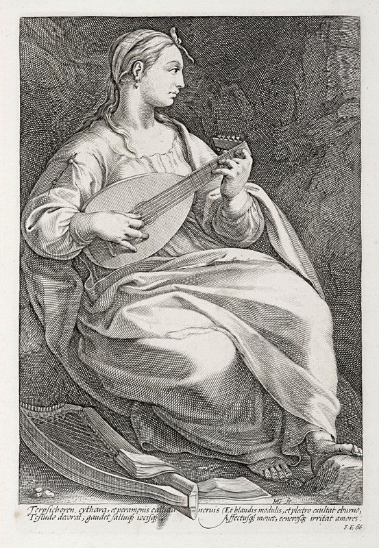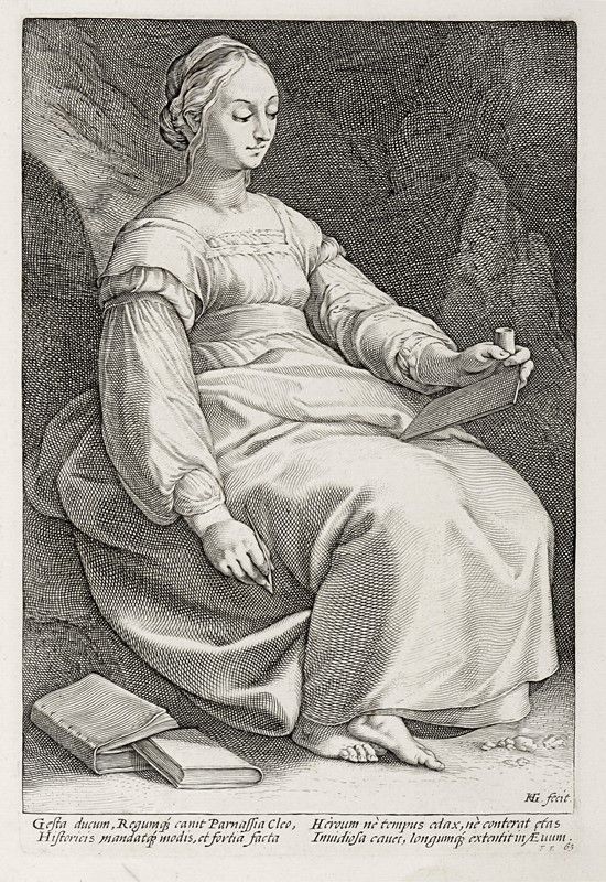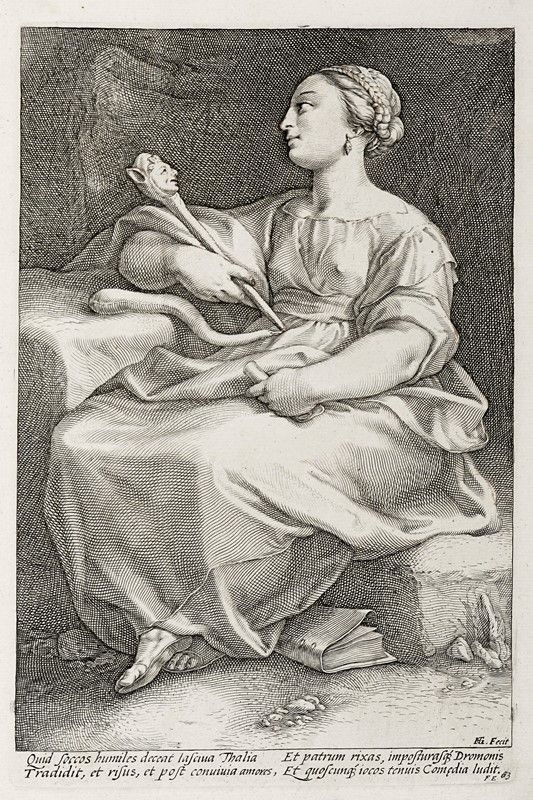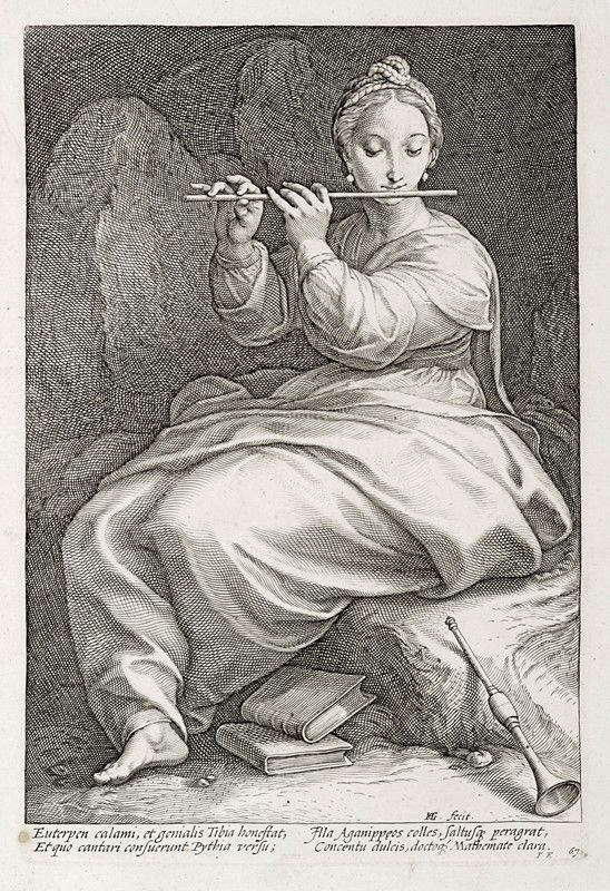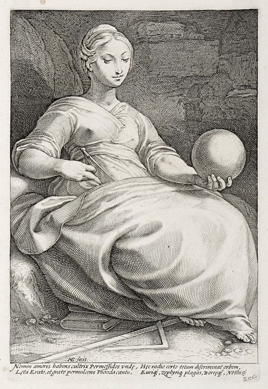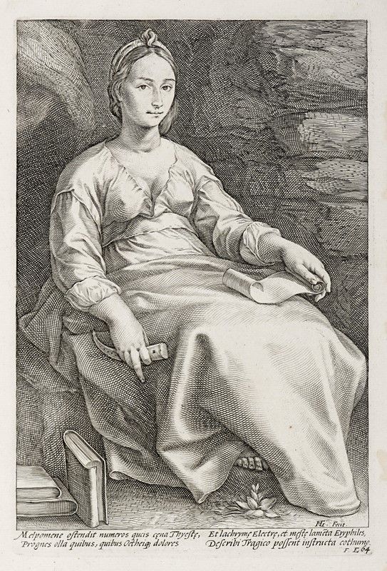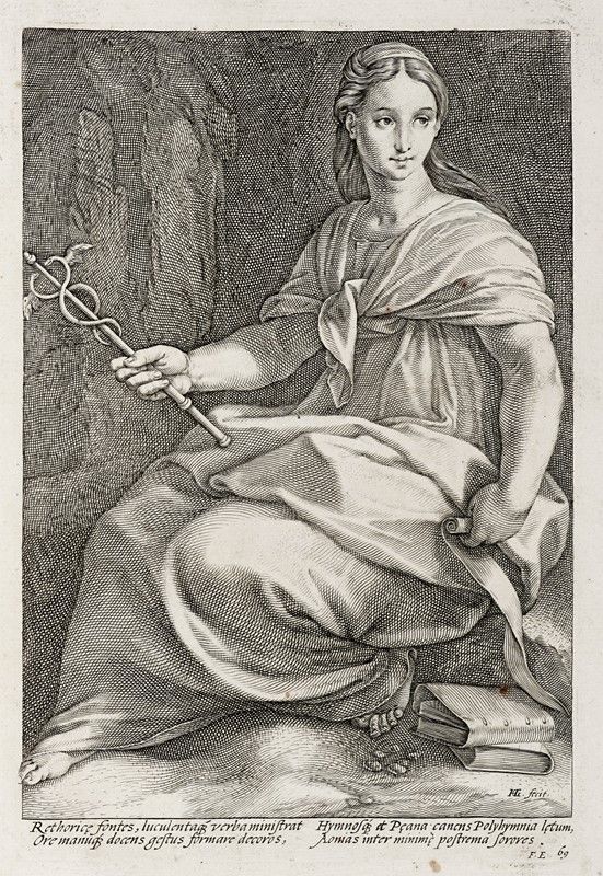 Bulino. mm 247/250x165. Foglio: mm 270x188. Hollstein, 148-156. New Hollstein, 129-137. Serie completa e omogenea, tutte le incisioni recano in basso il monogramma dell'autore e al margine inferiore versi latini su due righe di Franco Estius e all'angolo destro il numero della serie; la data 1592 compare invece solo sulla prima tavola raffigurante Calliope insieme alla dedica a Jan Sadeler. Ottime impressioni nel IV stato di 5 dopo la comparsa della numerazione, stampate su bella carta vergellata lievemente rigida con filigrana piccolo grappolo d'uva e iscrizione visibile su gran parte dei fogli.
