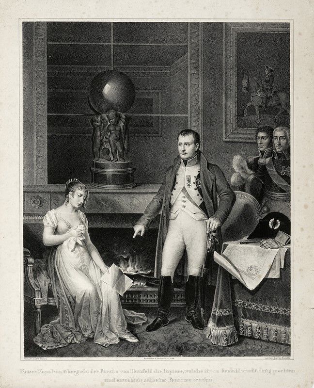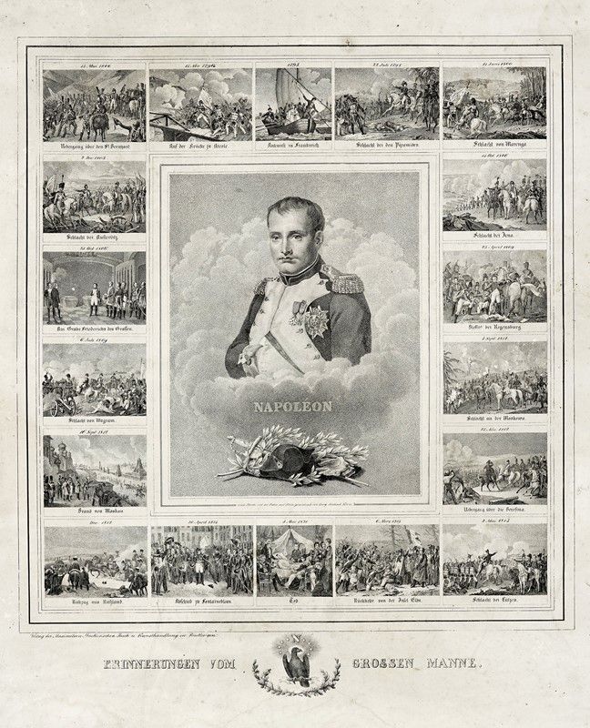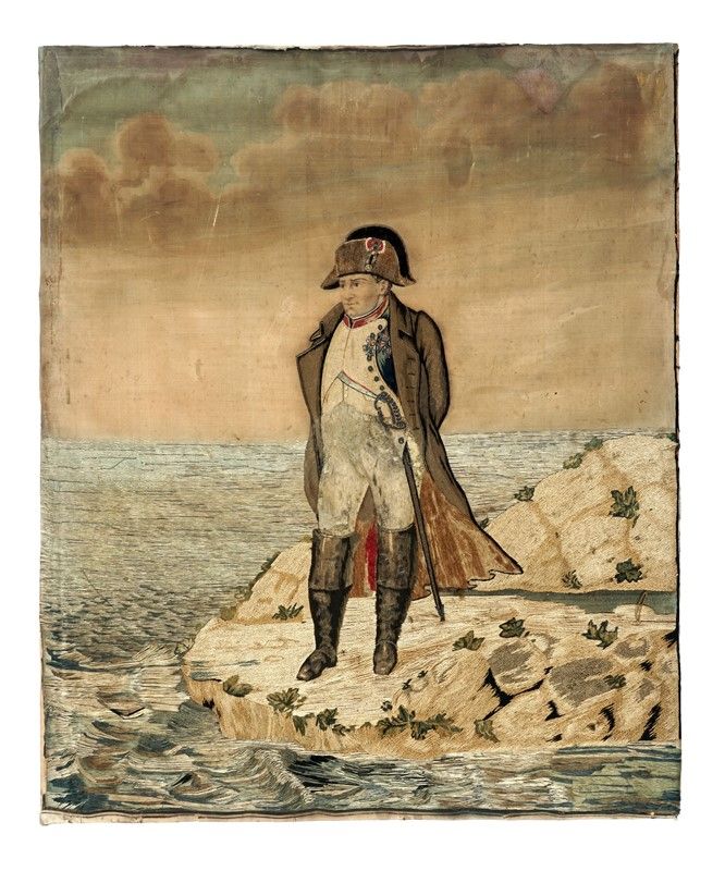Corposo lotto di 109 stampe. Tecniche e dimensioni varie. Da segnalare: Jean-Baptiste Isabey (1767/ 1855) [da]. Bonaparte nel giardino della Malmaison. Piccola litografia a colori. mm 105x75. In cornicetta in ottone dorato con fiocco in alto. Con cornice: cm14x9 / H. Bertrand [da], Napoleone a Sant’Elena, Ricamo in seta. mm 605x500. Si aggiungono ritratti di Napoleone I, di Joséphine de Beauharnais, Maria Letizia Ramolino, Napoleone III, scene di battaglia, piccole scene belliche.