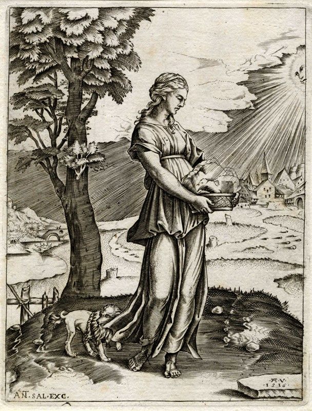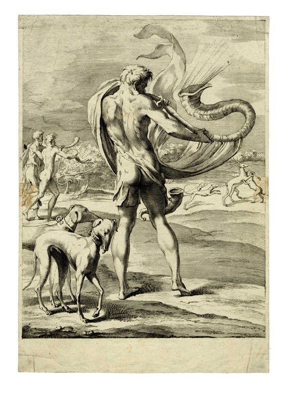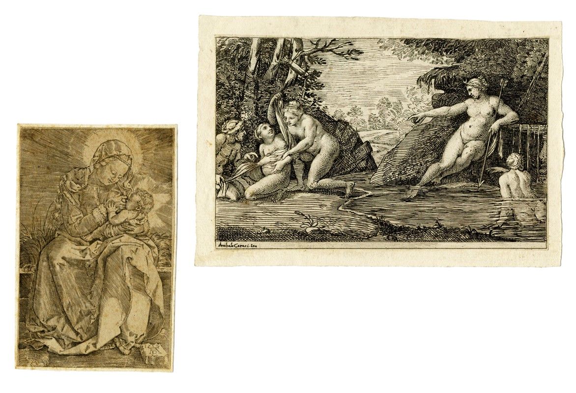 Tecniche varie (acquaforte, bulino, xilografia, litografia) e dimensioni varie. Agostino Veneziano [da Raffaello], Venere e Cupido / Sibilla cumana. 1516. Bartsch, XIV,123, 286. Tirature tarde su carta spessa. / Salvator Rosa. Divinità fluviali 1660-1665. Wallace, 96. Ottima impressione su carta pesante./ Giovanni Antonio Faldoni [dal Parmigianino]. Cacciatore che suona il corno con i suoi cani. Da Varii Disegni inventati dal celebre Francesco Mazzuola detto il Parmigianino tratti della raccolta Zanettiana, 1735. / Hans Burgkmair. Tre tavole da Der Weisskunig, edizione 1775. / Albrecht Durer [da]. La Vergine che allatta. Copia in controparte. Meder, 39. Bartsch, VII,36. / Litografia Cuviller (XIX secolo). Due vedute di Mosca con l'Arsenale del Cremlino e il Teatro. 1840 ca. / Carlo Cesi [da]. Diana scopre la gravidanza di Callisto. Copia in controparte, invenzione di Annibale Carracci.
