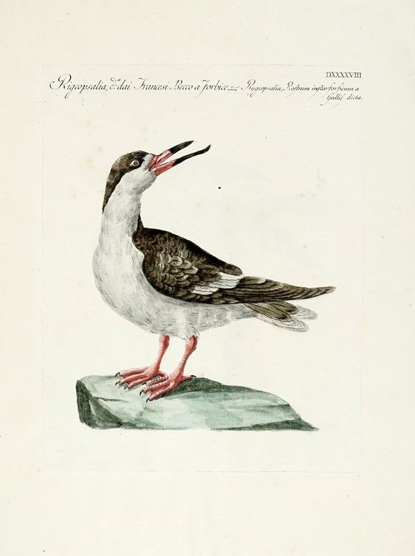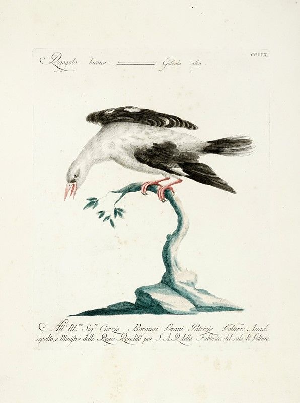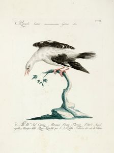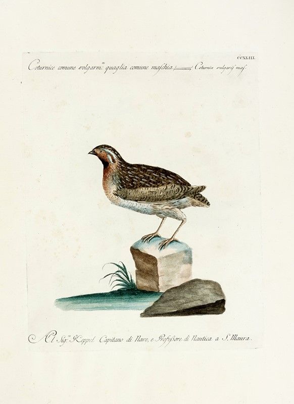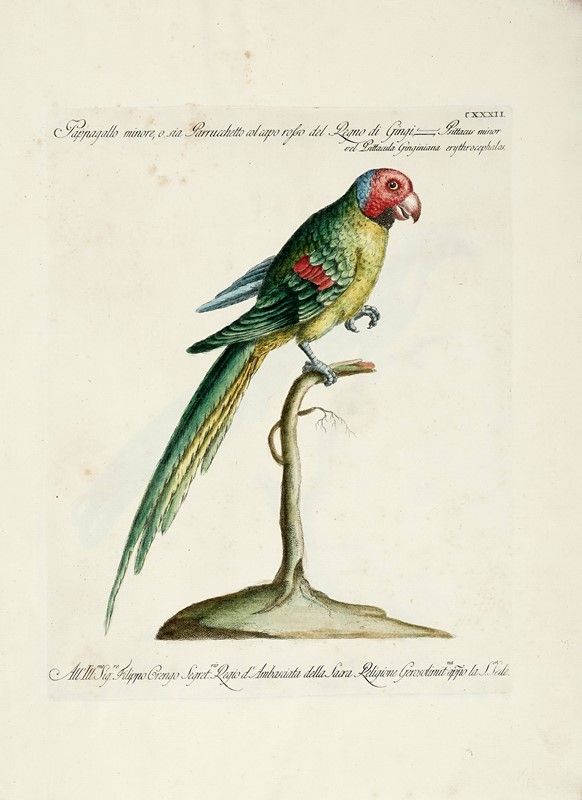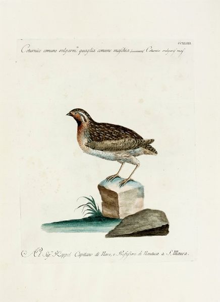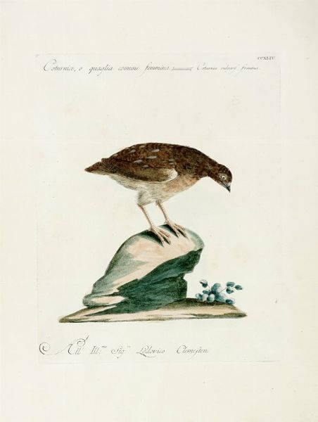 Lotto composto da sei incisioni all'acquaforte colorate a mano. mm 345x273/5 (ciascuna). Fogli: mm 490x375 (ciascuno). Tavole nn. CXXXII (Pappagallo minore), LXXX (Cucule celeste), CCXLIV (Coturnice o quaglia comune), CCXLIII (Coturnice comune), DXXXXVIII (Rigopsalia), CCIX (Rigogolo bianco), tratte dall'opera Ornithologia methodice digesta atque iconibus aeneis ad vivum illuminata ornata (latine et italice a Xav. Manetti Laurentio Lorenzi et Violante Vanni). Florentiae, 1767-76. In alto didascalia descrittiva delle immagini; in basso, su alcune tavole, dedicatoria.