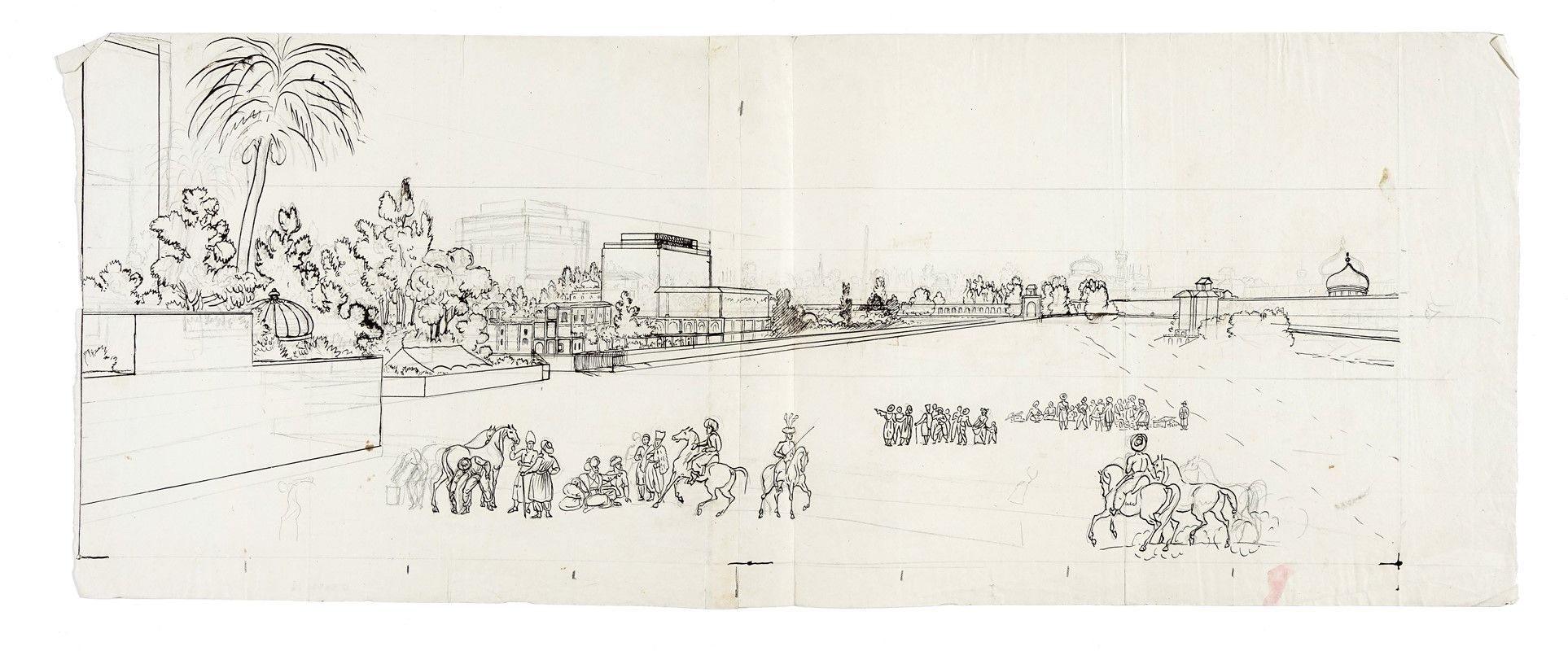 Penna e inchiostro di china, matita di grafite, carta bianca non vergellata. Al verso a matita di grafite la scritta "Ispaan". mm 404x605. SI AGGIUNGONO: Id., Due schizzi di minori dimensioni per lo stesso soggetto. mm 260/404x605/667.