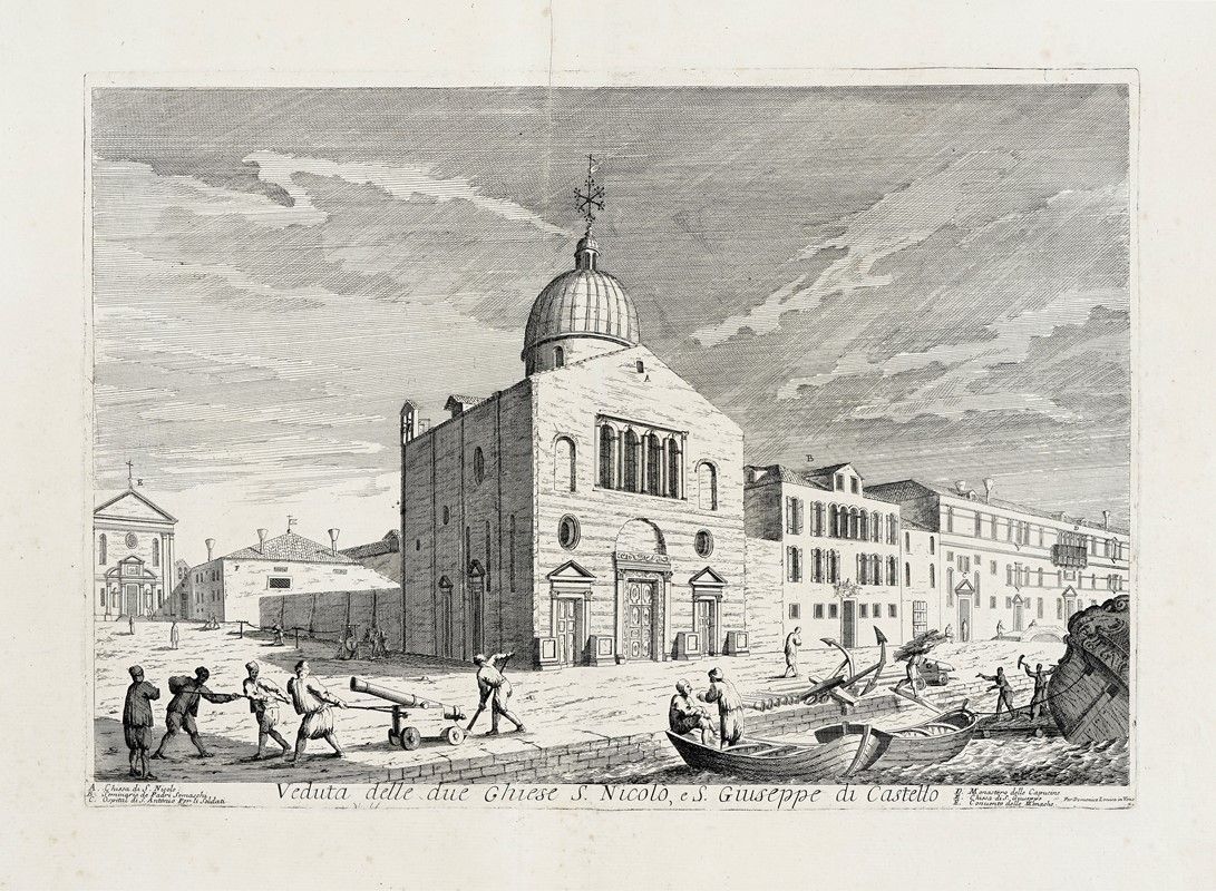 Acquaforte e bulino. mm 332x472. Foglio: mm 472x635. Da Il Gran Teatro di Venezia ovvero raccolta delle principali vedute e pitture che in essa si contengono diviso in due tomi, pubblicato per la prima volta nel 1717 dal Lovisa, editore attivo in Venezia nella prima metà del XVIII secolo.