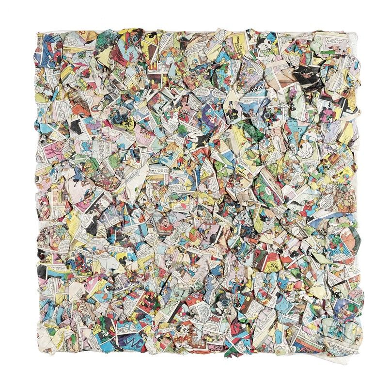 Collage su tela. cm 50x50. Firma, titolo, tecnica e dimensioni a pennarello nero sul verso della tela. Timbro ad inchiostro nero di Archivio Carmassi sul telaio. Opera accompagnata da autentica su fotografia dello stesso Archivio Carmassi.