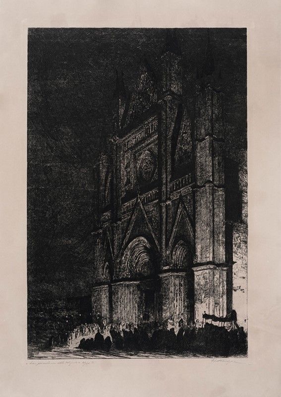 1) La processione delle reliquie. Acquaforte. mm 570x395. Foglio: mm 687x485. Titolato e numerato a matita in basso a sinistra, firmato a matita in basso a destra. Es. 44/50. 2) La caserma degli svizzeri. Acquaforte. mm 323x387. Foglio: mm 479x593. Firmata a matita in basso a destra. titolo e tiratura a matita in basso a sinistra. Es. 19/50.