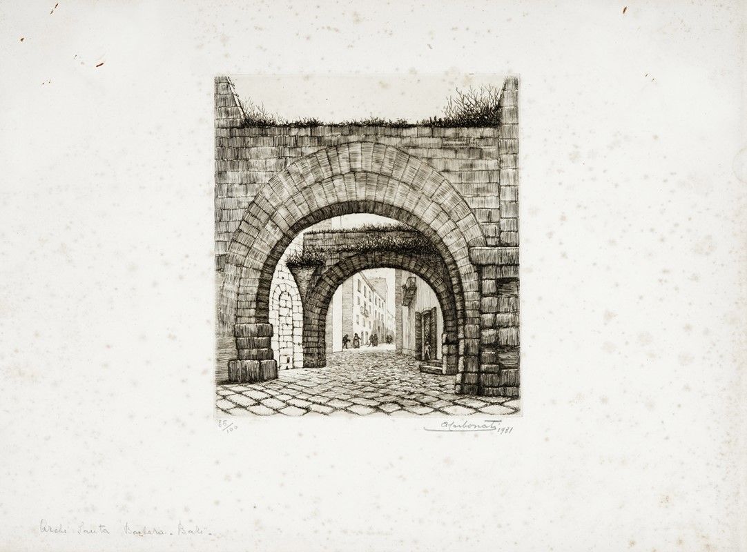 Raccolta di 4 acqueforti. mm 165/200x150/350. Fogli: mm 280x405 cad. Tutte firmate e datate a matita in basso a destra. Numerazione a matita in basso a sinistra. Titolate a matita all'angolo inferiore sinistro di ciascuna. Compongono il lotto le vedute di San Nicola, Archi Santa Barbara, Il castello Medievale e Castello Svevo. Tutti i soggetti sono localizzati a Bari. Es. 85/100. SI AGGIUNGE: Checchi A., L'ultima Zena. 1971. Acquaforte. mm 290x250. Foglio: mm 500x350. Firmata e datata in lastra in basso a sinistra, controfirmata a matita in basso a destra. Titolata e "Prova di stampa" a matita in basso a sinistra.