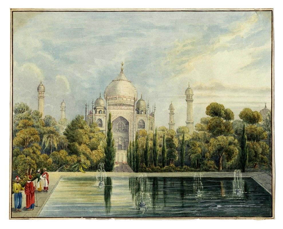 Acquerello e penna e inchiostro di china bruno su carta. mm 183x230. Data ed iscrizione "Taj Mahal; Mausoleo ad Agra, India" a matita al verso del foglio di supporto. Dettagliatissimo disegno dalla qualità ottima.