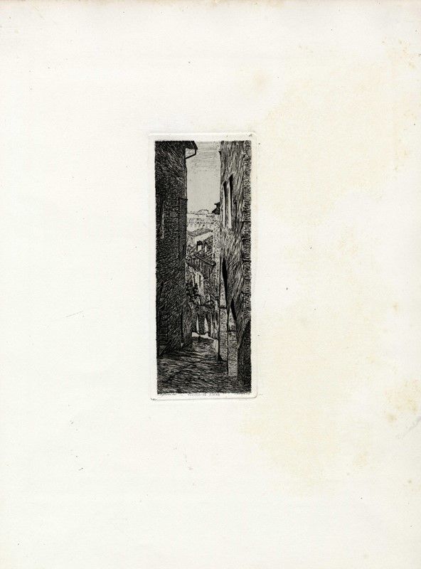 Acquaforte. mm 165x70. Foglio: mm 375x290. Firma, titolo e dati editoriali in lastra lungo il margine inferiore.