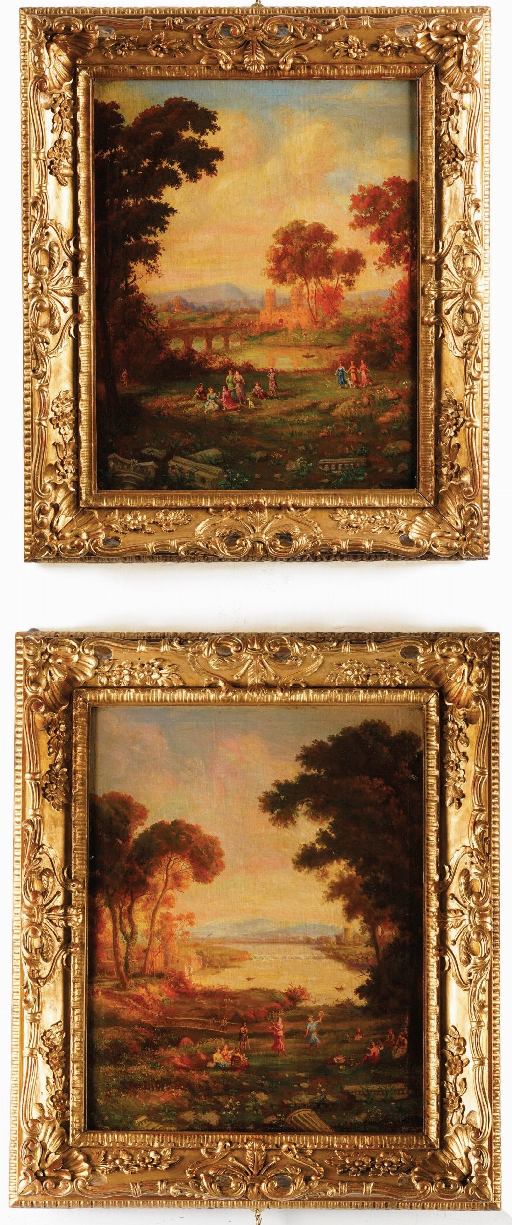 Pittore del XIX secolo Paesaggi fluviali con figure di contadini
