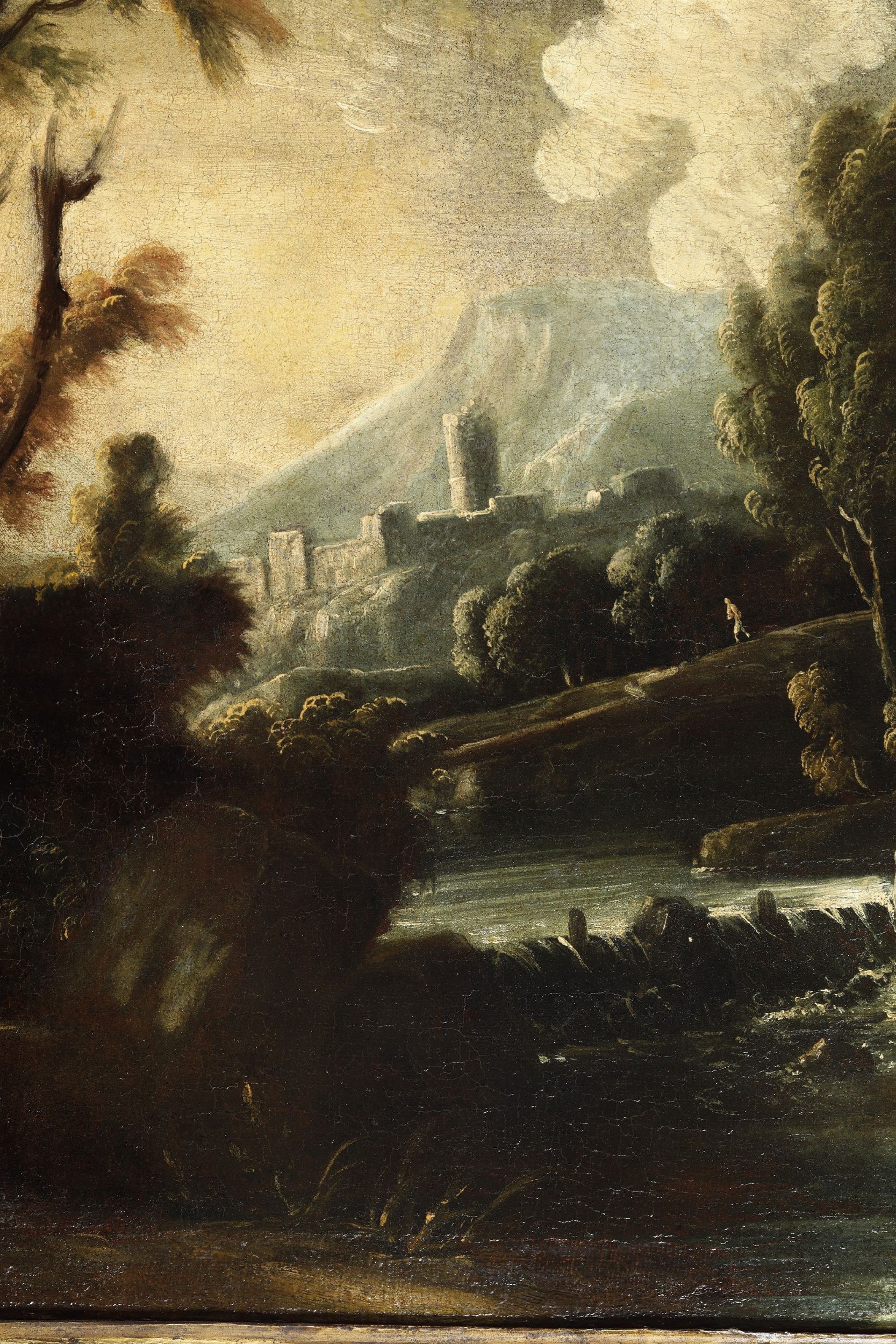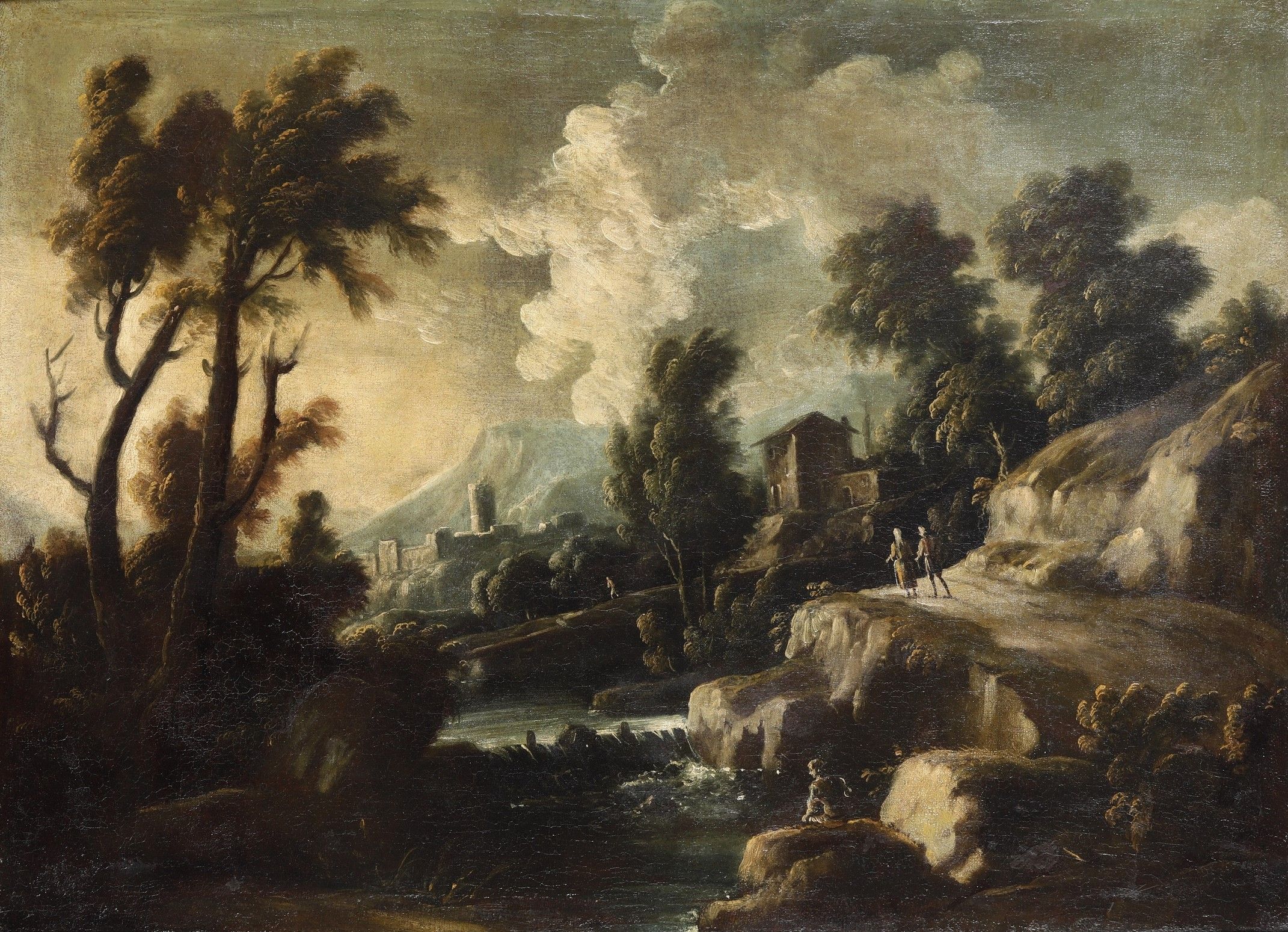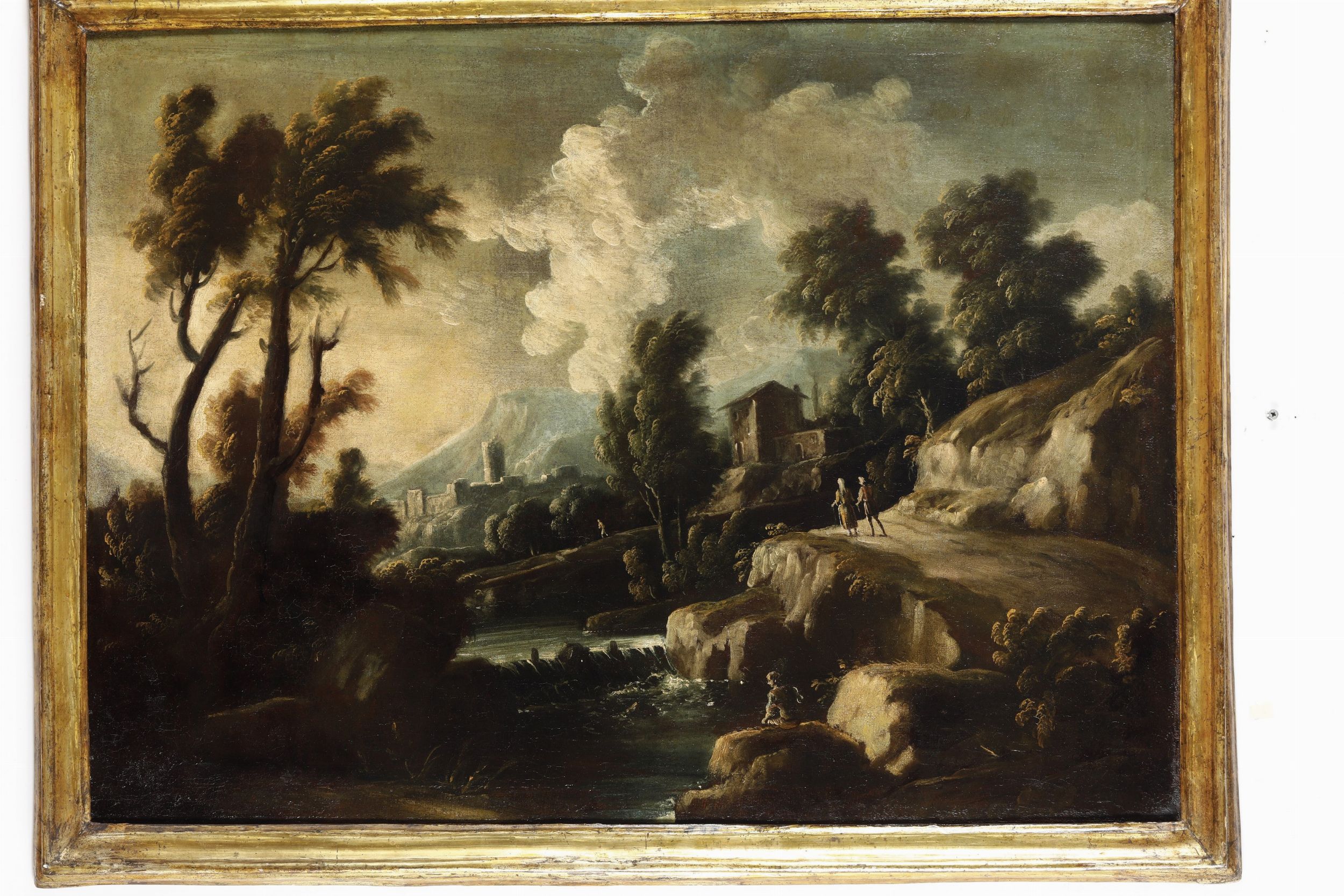 Scuola del XVIII secolo Paesaggio fluviale con contadini
