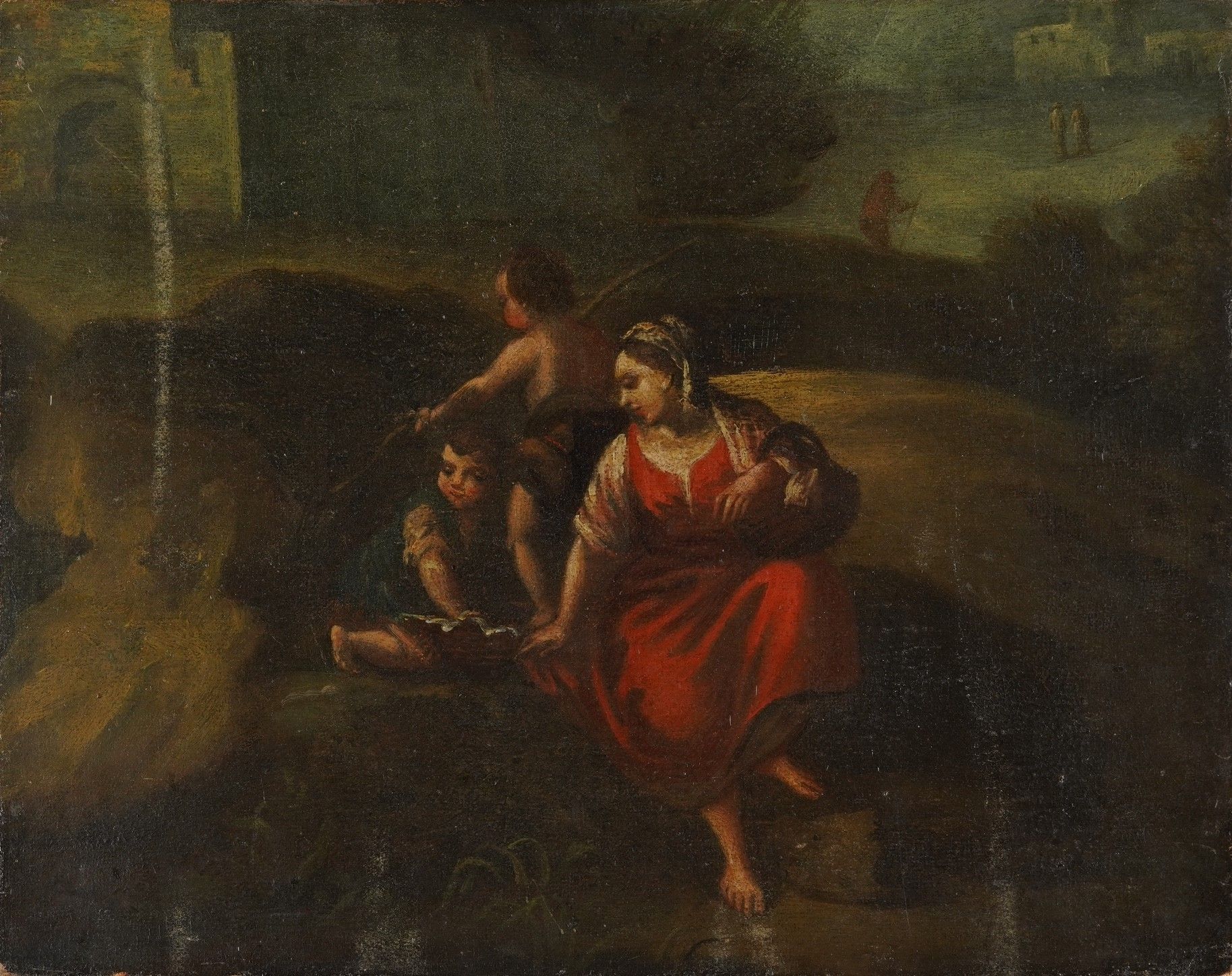 Scuola veneta del XVIII secolo Contadina con bambini in riva a un fiume
