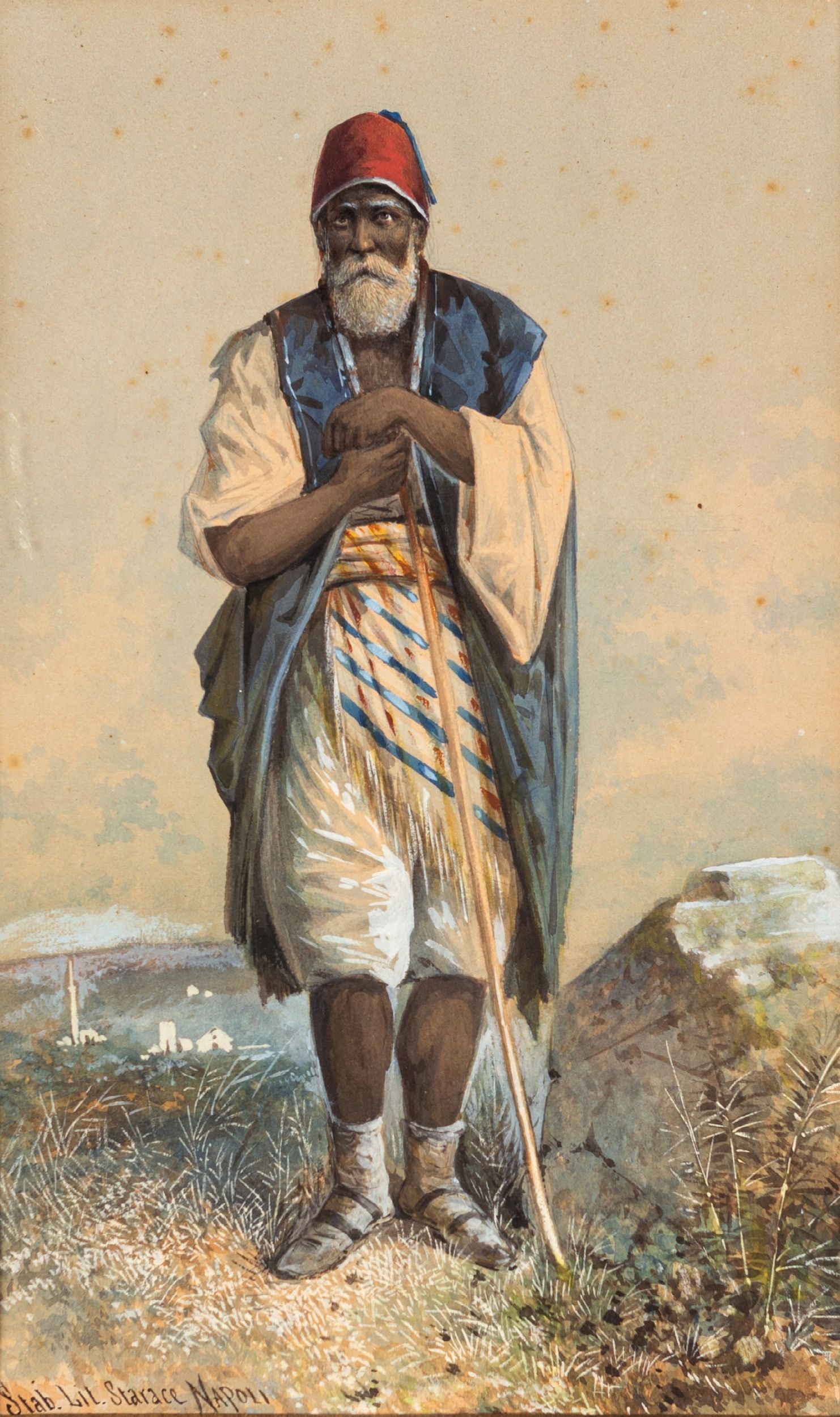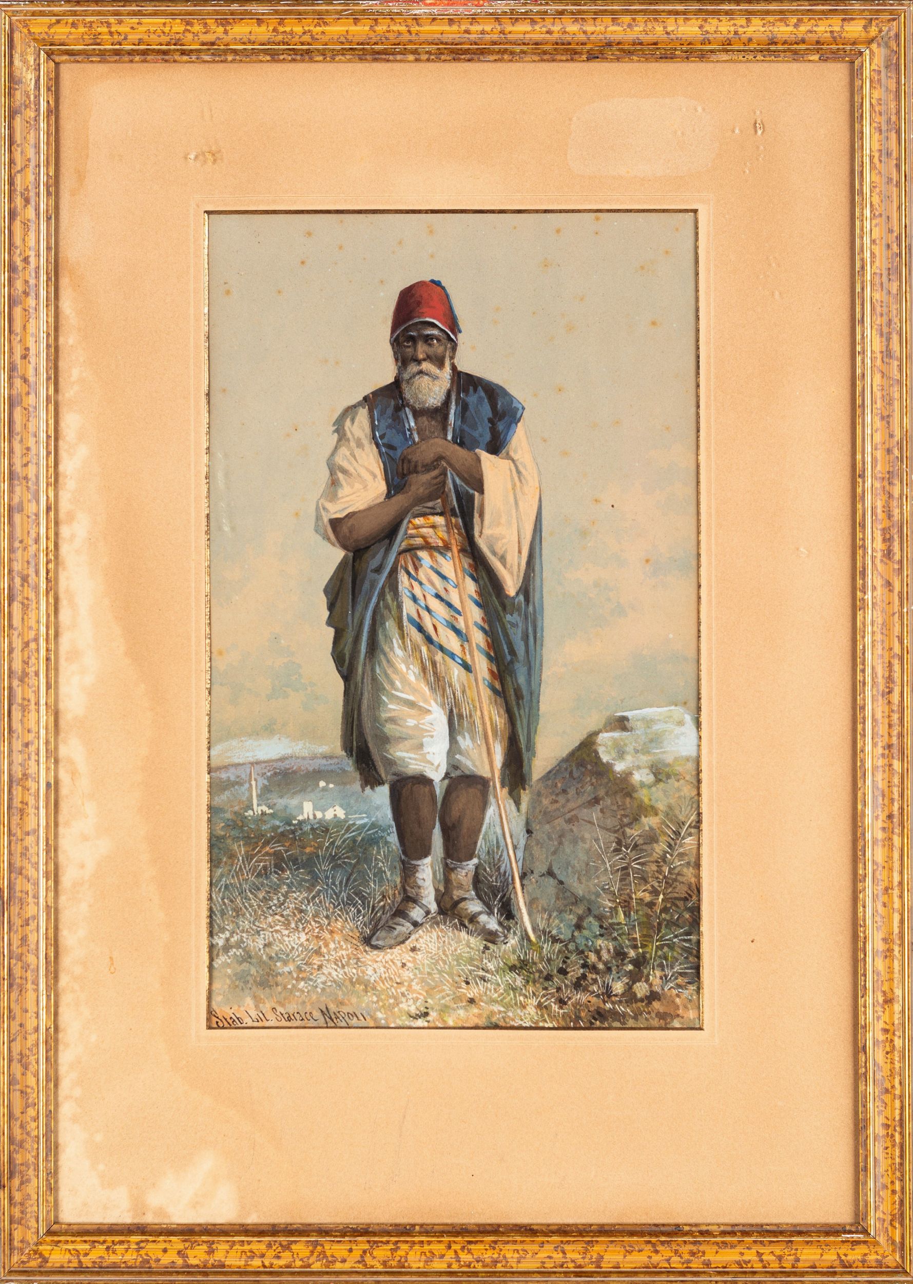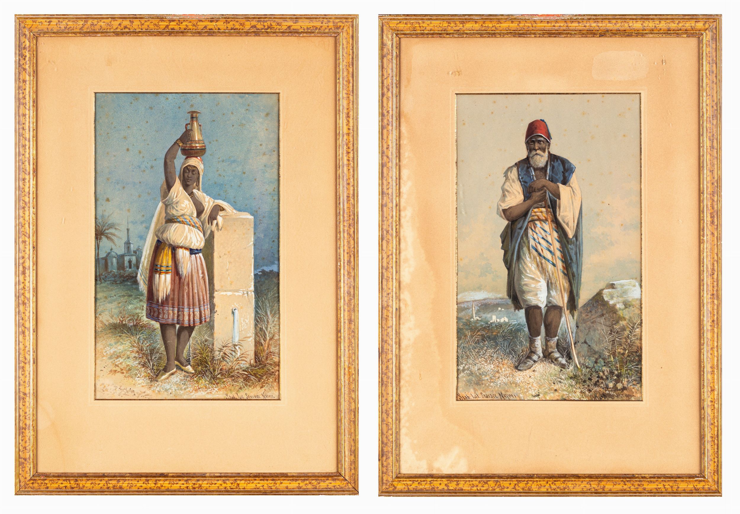 Coppia di acquerelli su carta a) vecchio pastore b) giovane donna alla fonte