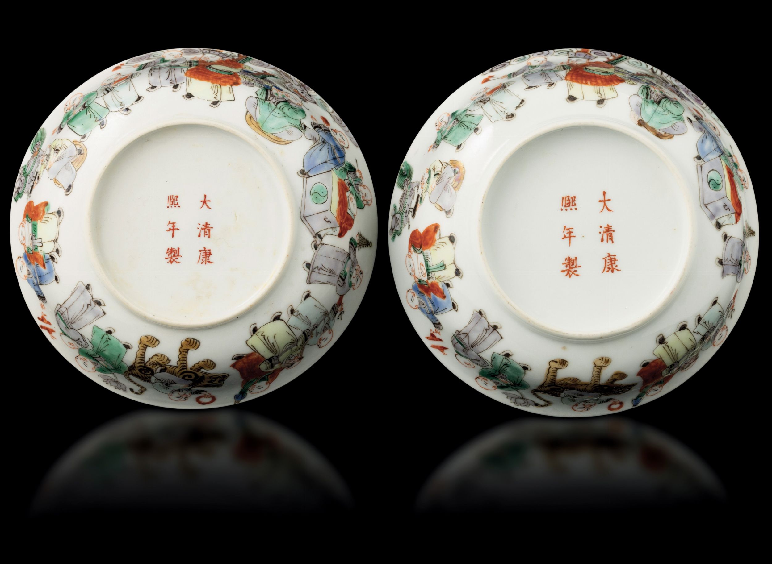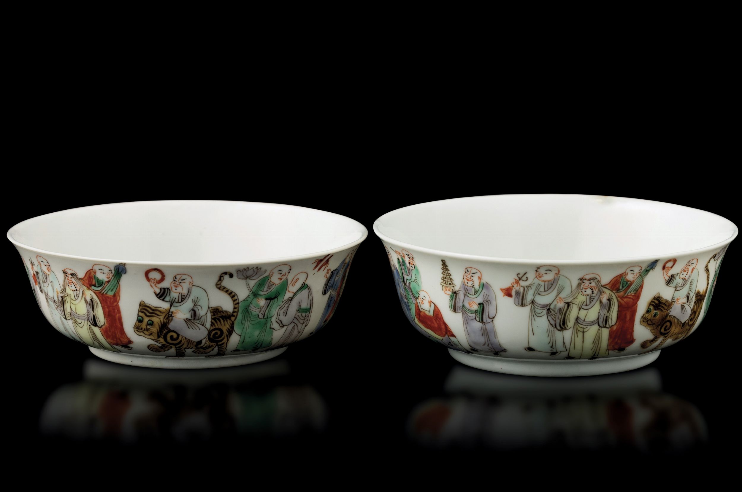 Coppia di ciotole in porcellana Famiglia Verde a decoro con personaggi, Cina, XX [..]