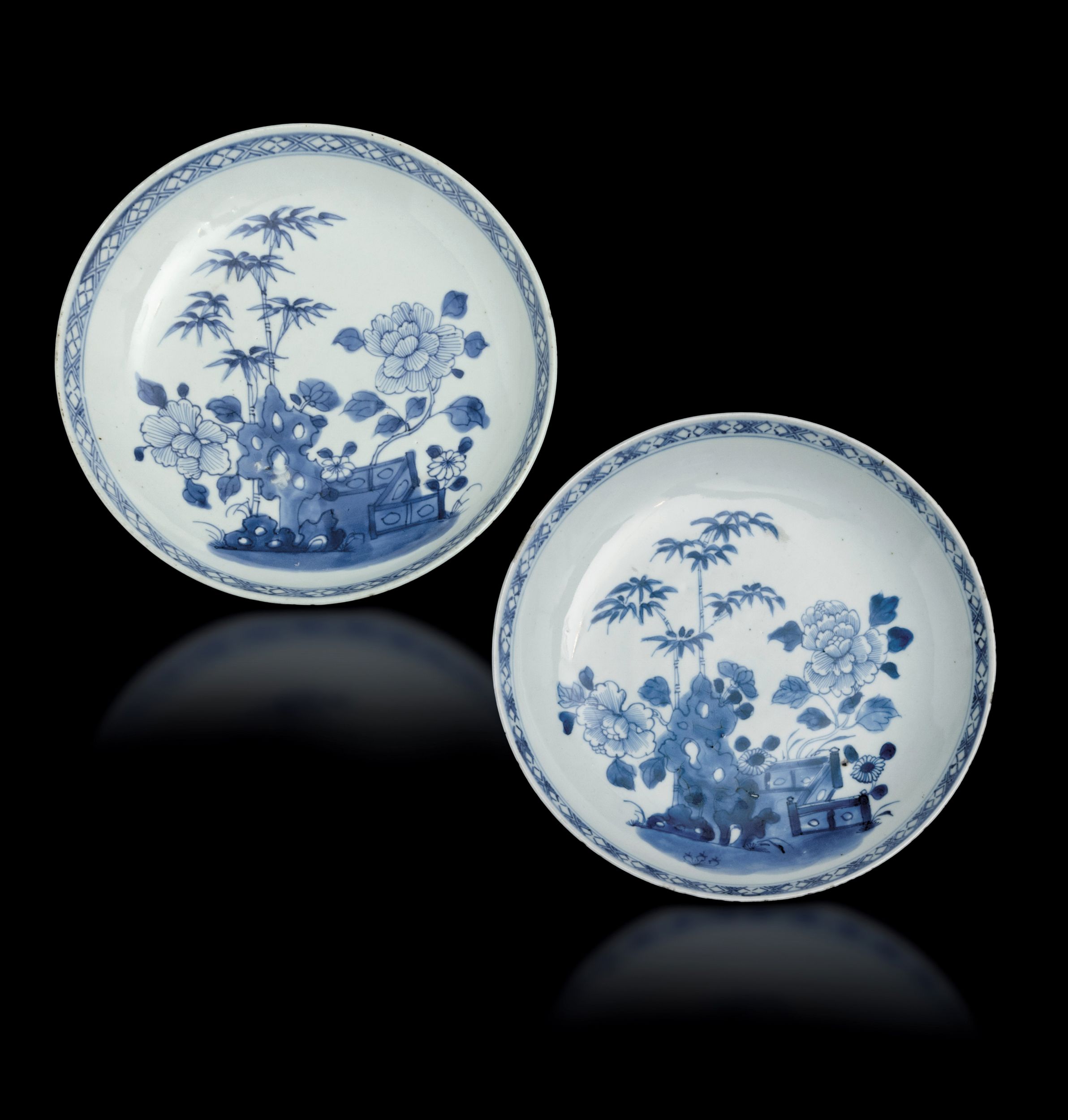 Coppia di piattino in porcellana bianca e blu con decori floreali, Cina, Dinastia [..]