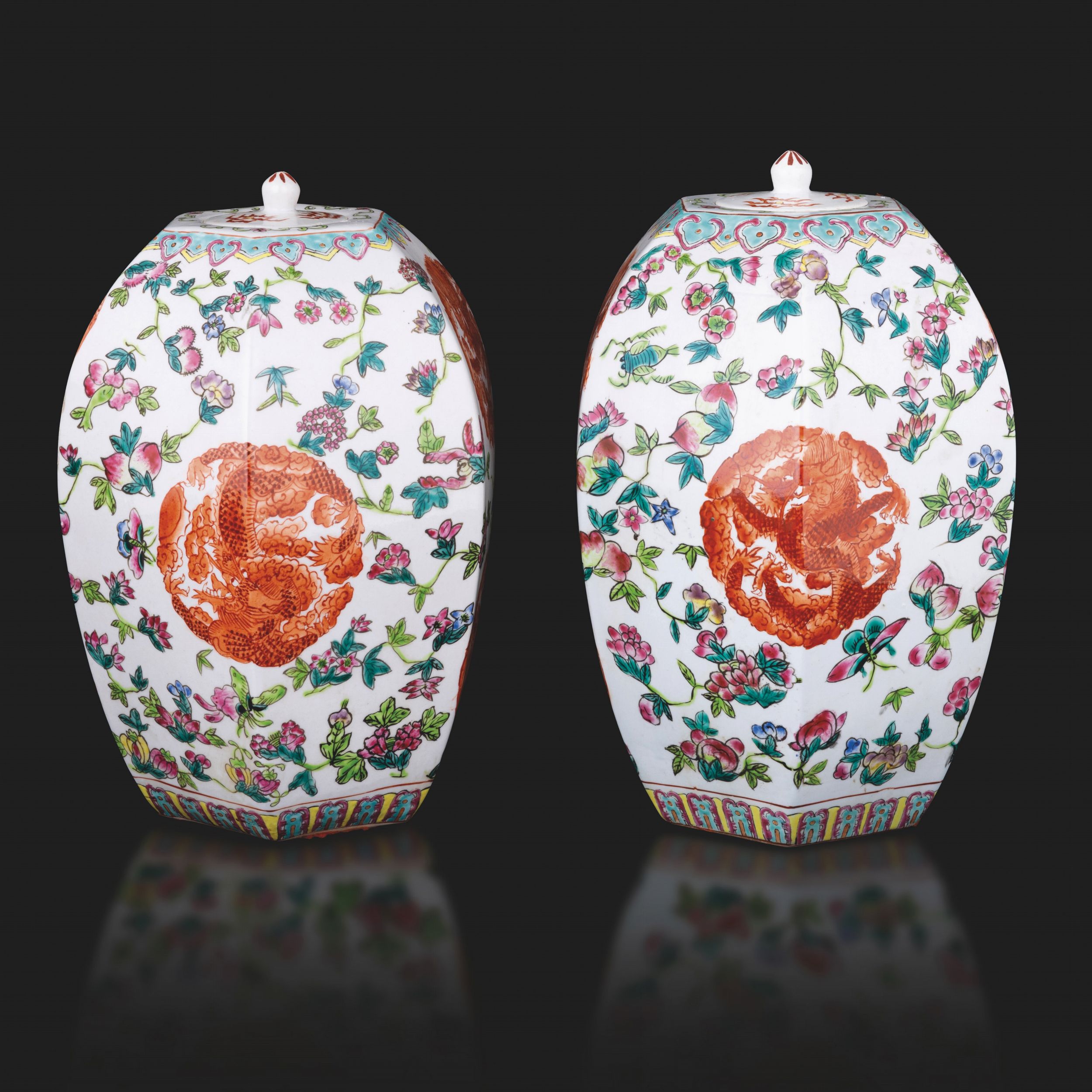 Coppia di vasi in porcellana Famiglia Rosa a pianta esagonale con motivi floreali [..]
