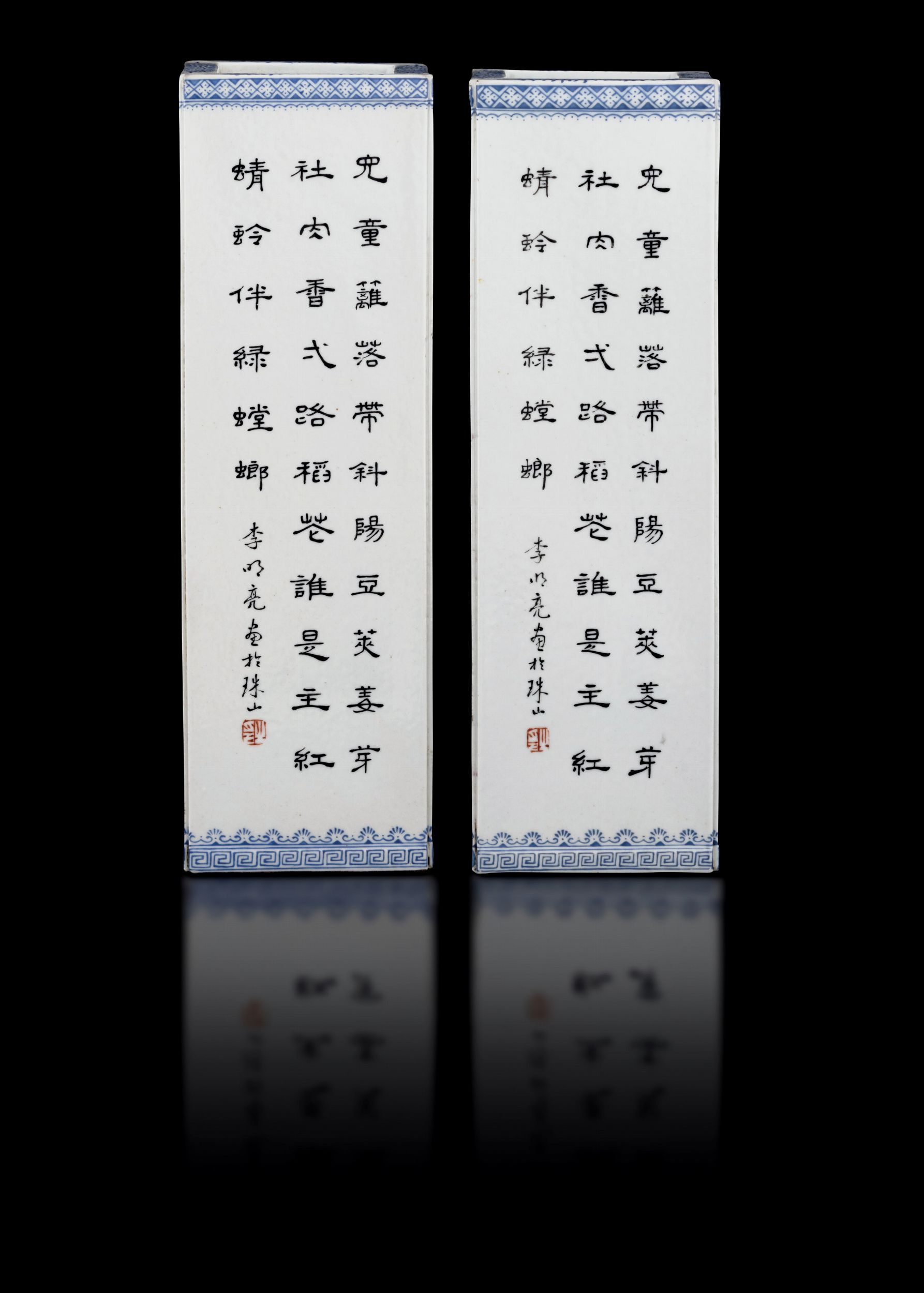 Coppia di Vasi in porcellana policroma a decoro paesaggistico con iscrizioni, Cina, [..]