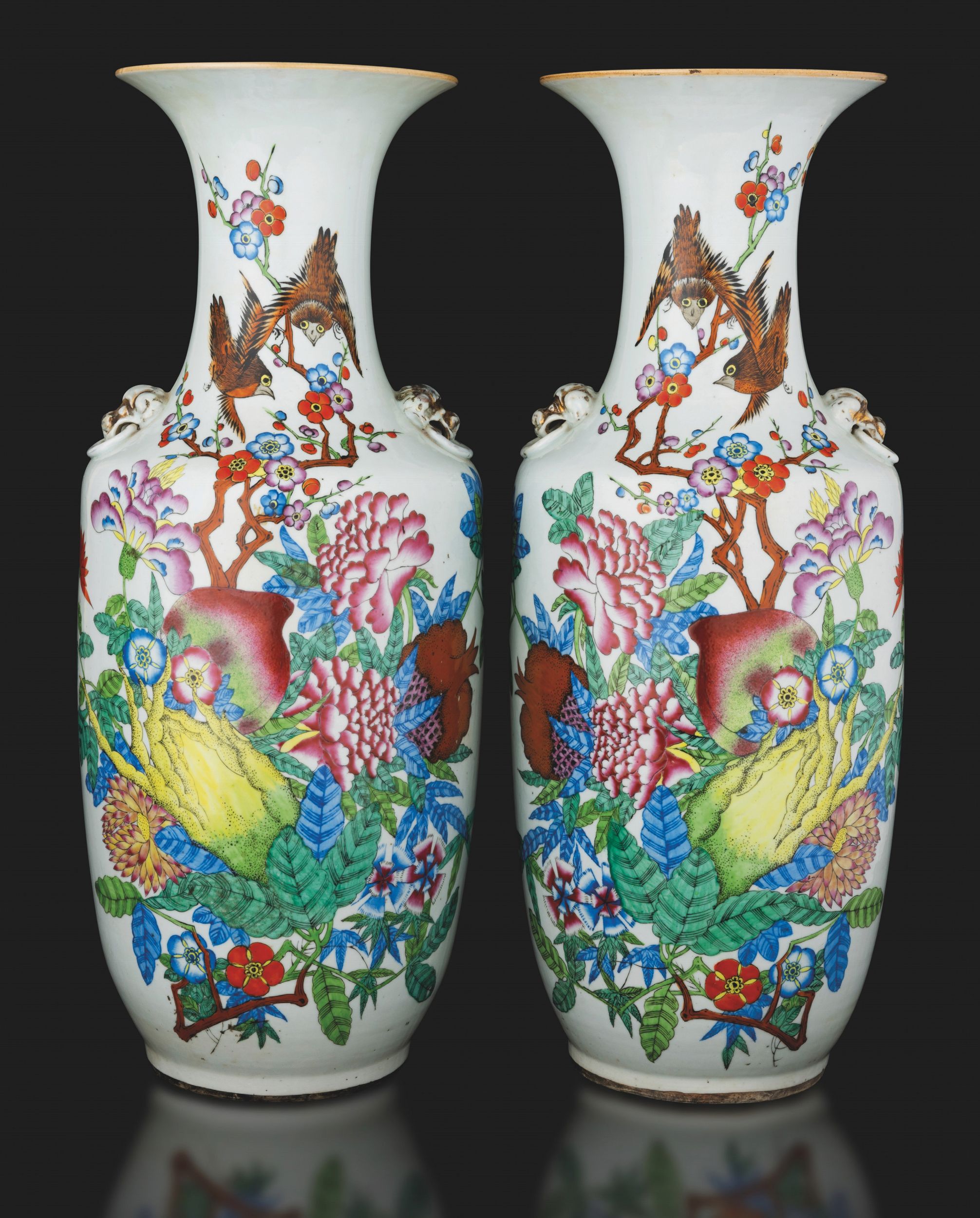 Coppia di vasi in porcellana raffiguranti paesaggio con uccelli, iscrizioni e mascheroni [..]