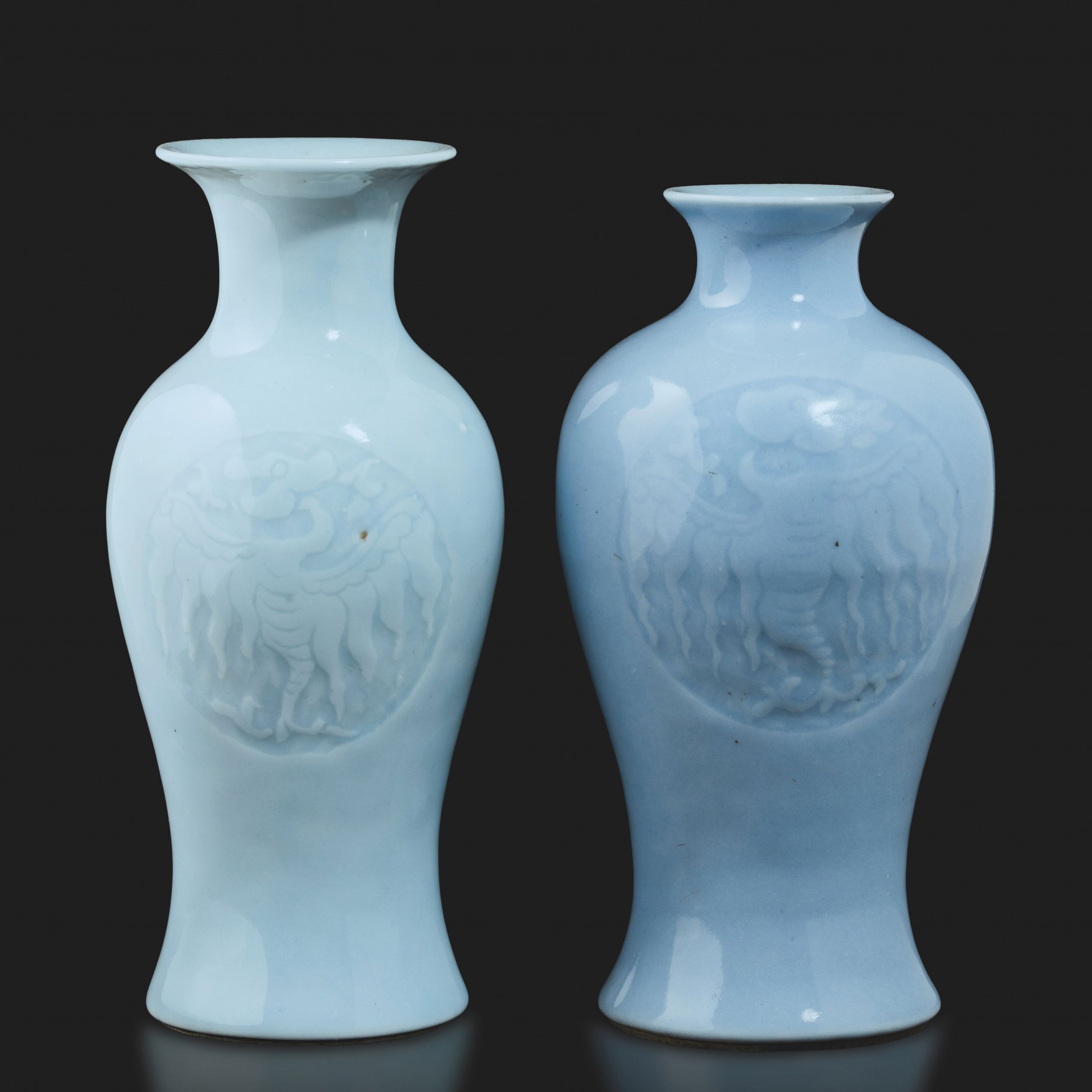 Due vasi in porcellana monocroma Clair de Lune con figure di fenici, Cina, Dinastia [..]