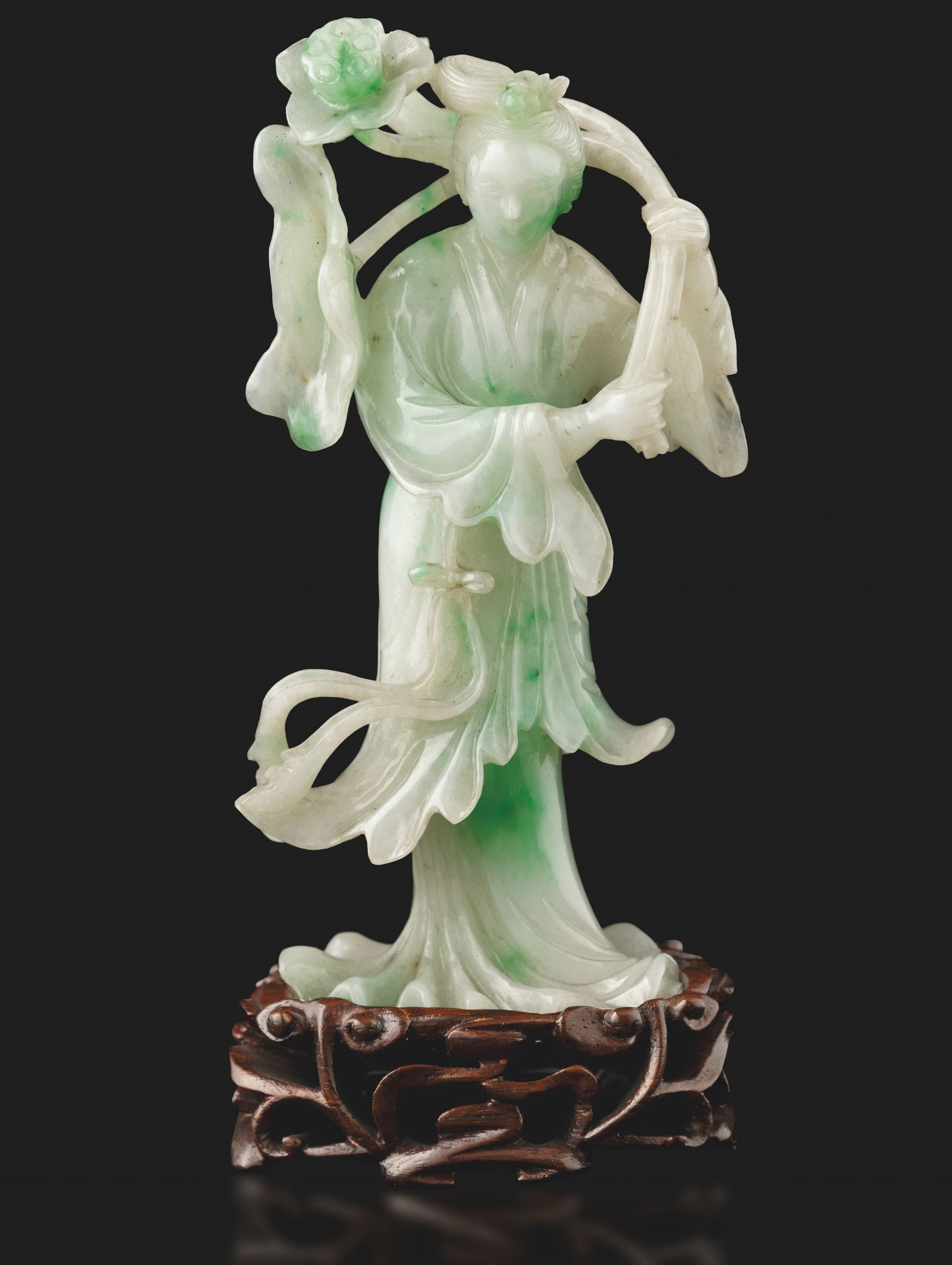 Figura di fanciulla con fiori scolpita in giadeite con sfumature green apple, Cina, [..]