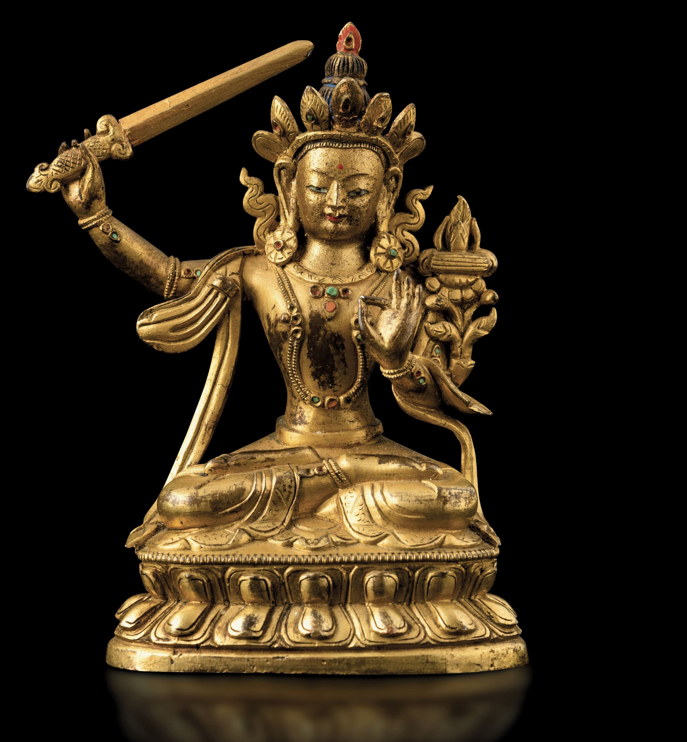 Figura di Manjushri seduta su doppio fiore di loto in bronzo dorato, innesti di [..]