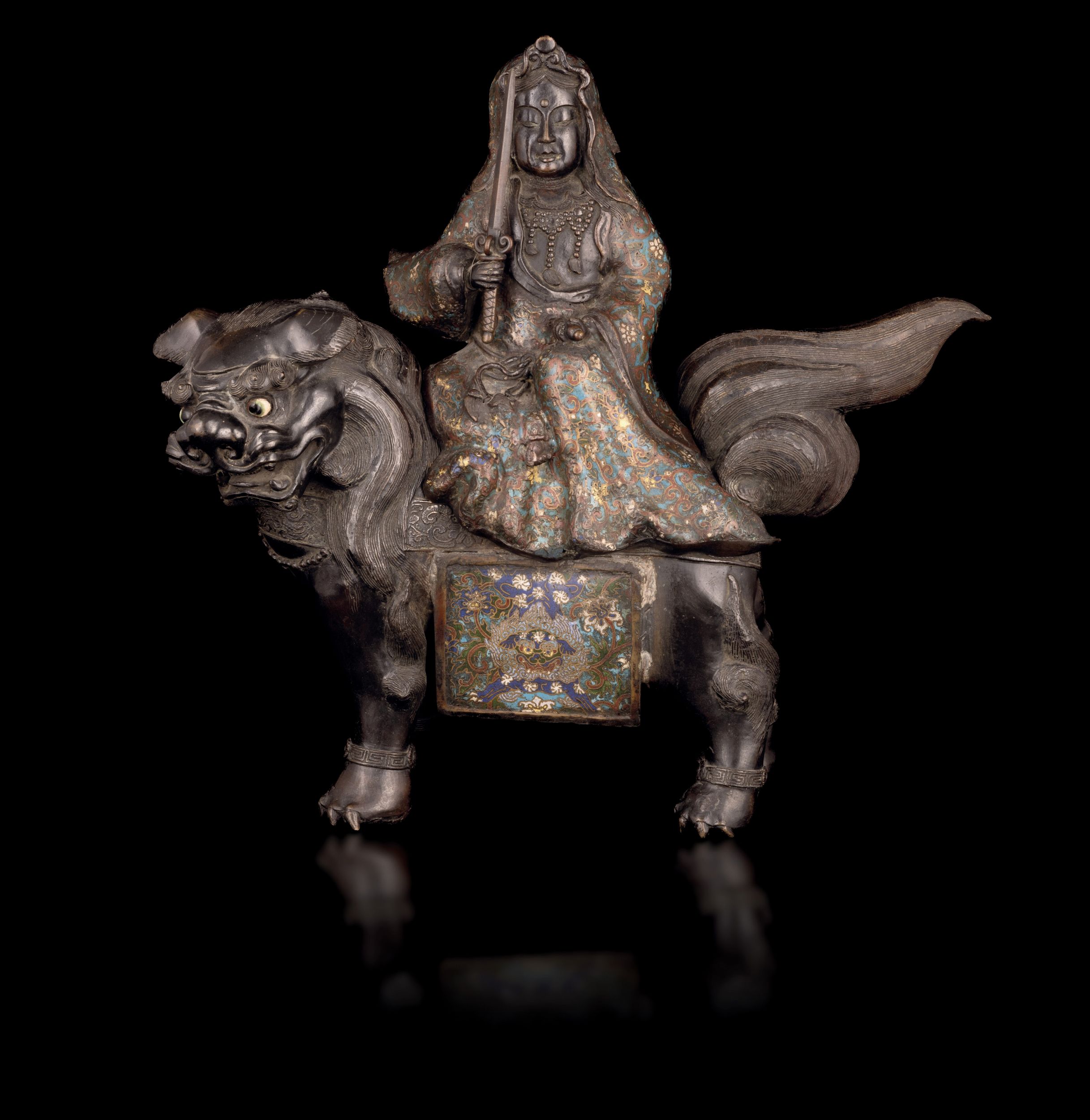 Figura di Samurai in bronzo cloisonné su cane di Pho, Giappone, periodo Meiji (1 [..]