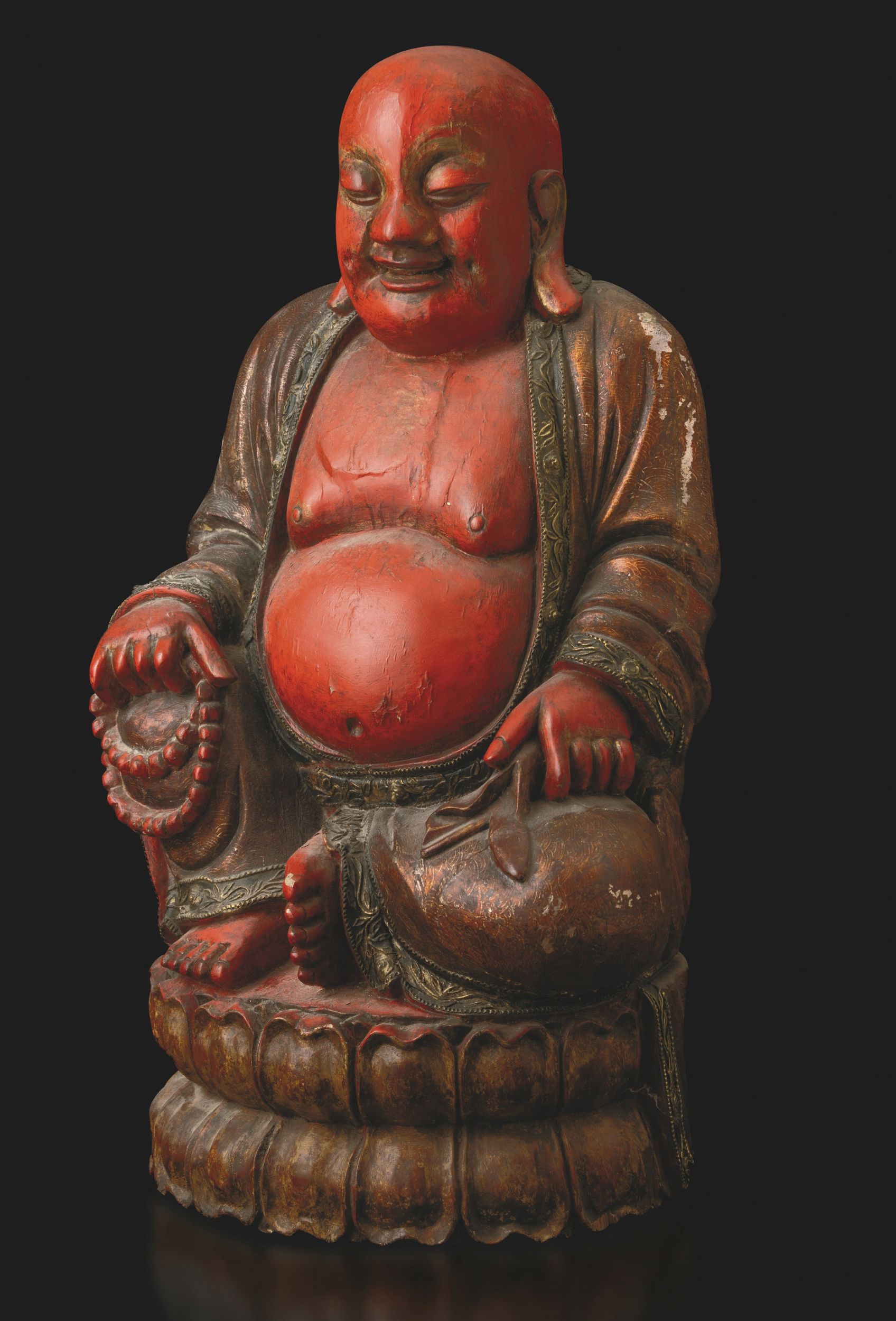 Grande figura di Budai in legno laccato Cina, Dinastia Qing, XIX secolo