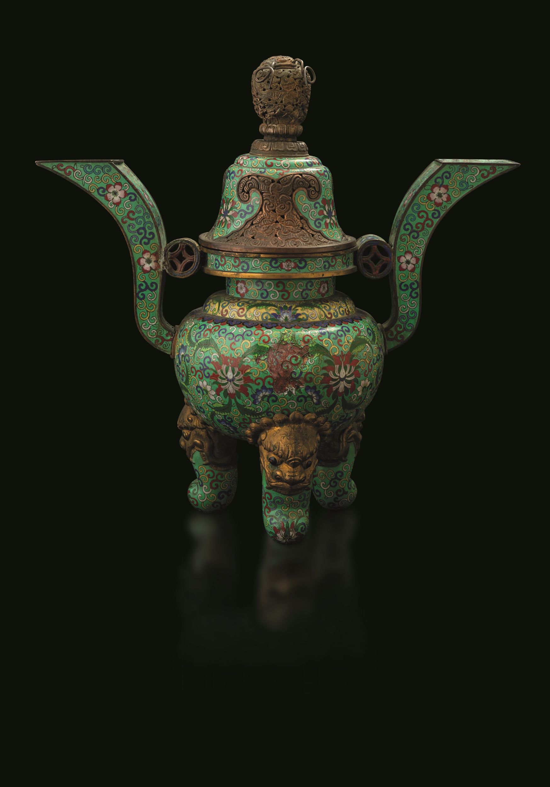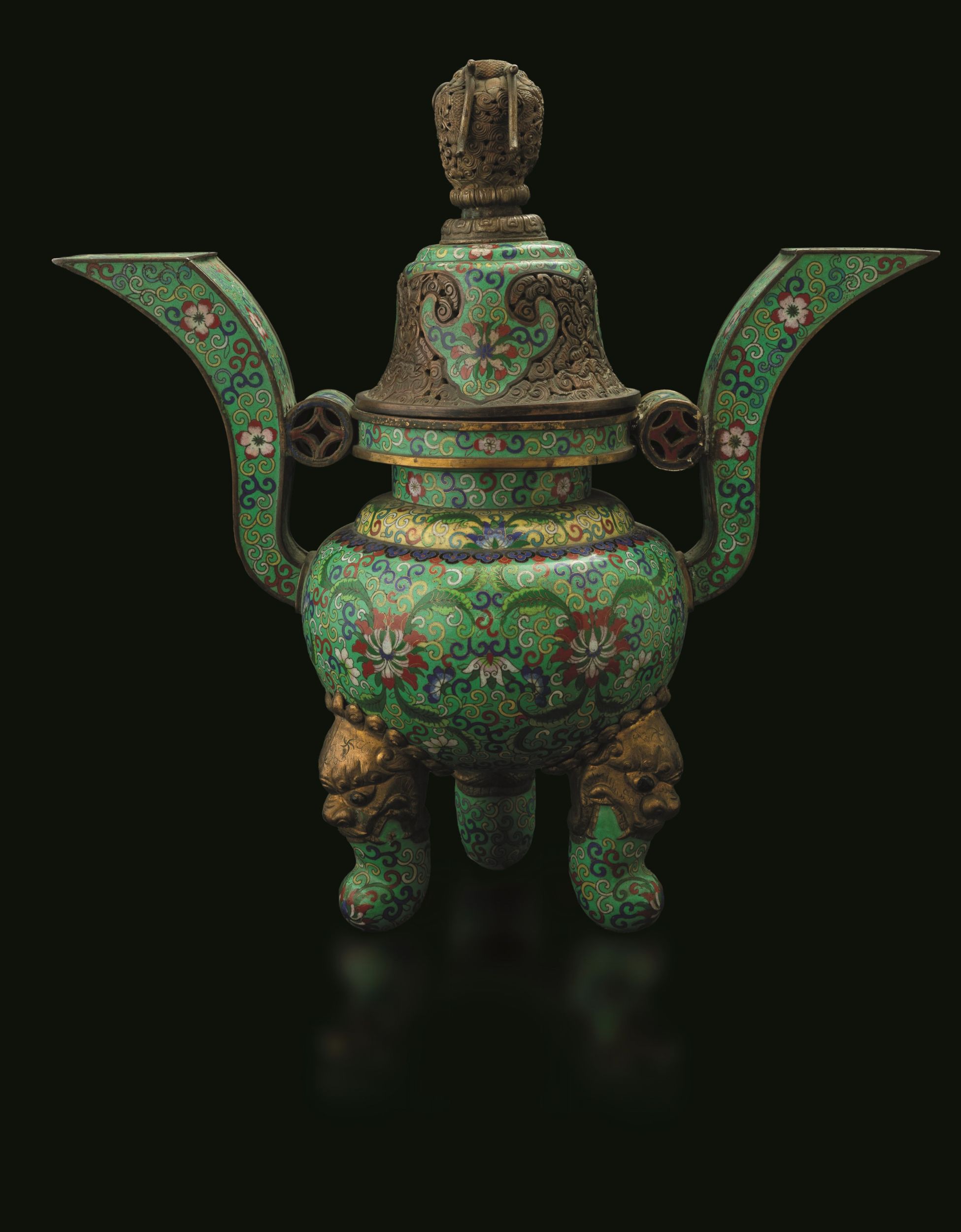 Grande incensiere tripode a smalti cloisonnè con decori a fiore di loto e coperchio [..]